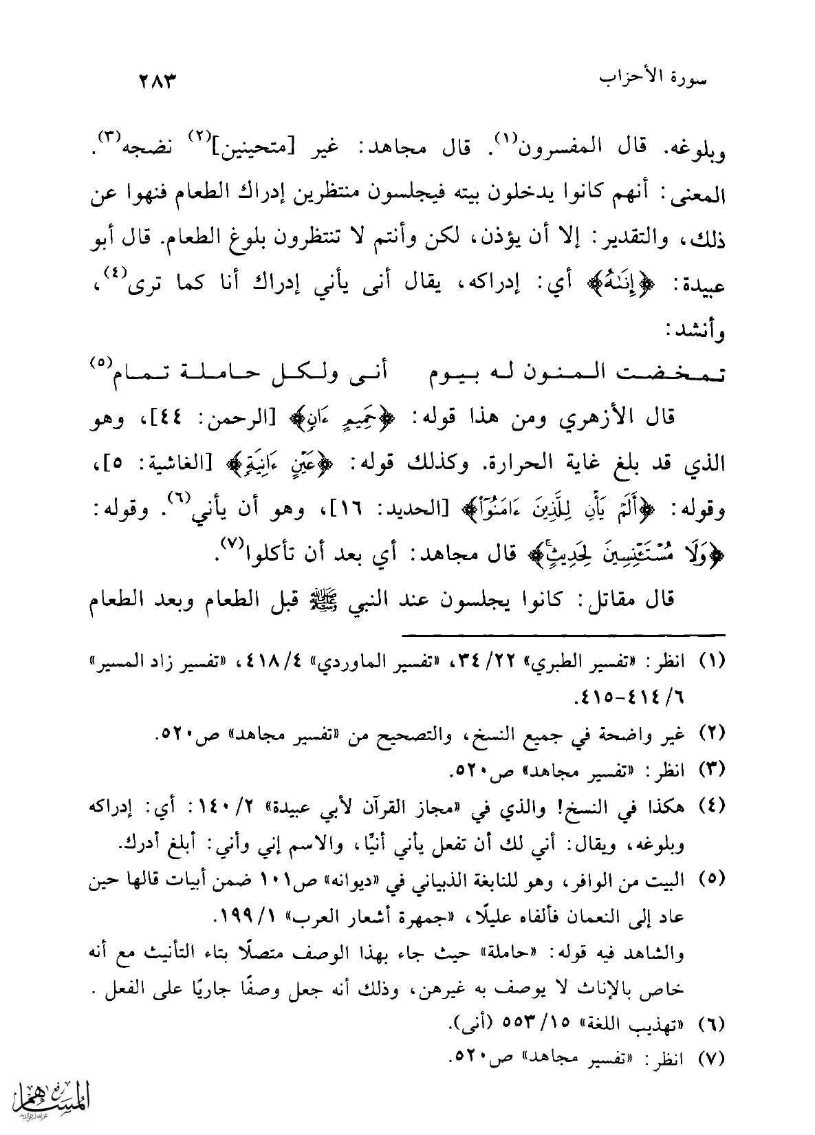 وبلوغه. قال المفسرون (¬1). قال مجاهد: غير [متحينين] (¬2) نضجه (¬3). المعنى: أنهم كانوا يدخلون بيته فيجلسون منتظرين إدراك الطعام فنهوا عن ذلك، والتقدير: إلا أن يؤذن، لكن وأنتم لا تنتظرون بلوغ الطعام. قال أبو عبيدة: {إِنَاهُ} أي: إدراكه، يقال أنى يأني إدراك أنا كما ترى (¬4)، وأنشد: