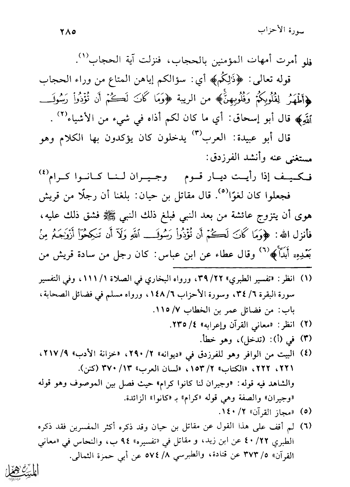 فجعلوا كان لغوًا (¬5). قال مقاتل بن حيان: بلغنا أن رجلاً من قريش هوى أن يتزوج عائشة من بعد النبي فبلغ ذلك النبي -صلى الله عليه وسلم- فشق ذلك عليه، فأنرل الله: {وَمَا كَانَ لَكُمْ أَنْ تُؤْذُوا رَسُولَ اللَّهِ وَلَا أَنْ تَنْكِحُوا أَزْوَاجَهُ مِنْ بَعْدِهِ أَبَدًا} (¬6) وقال عطاء عن ابن عباس: كان رجل من سادة قريش من