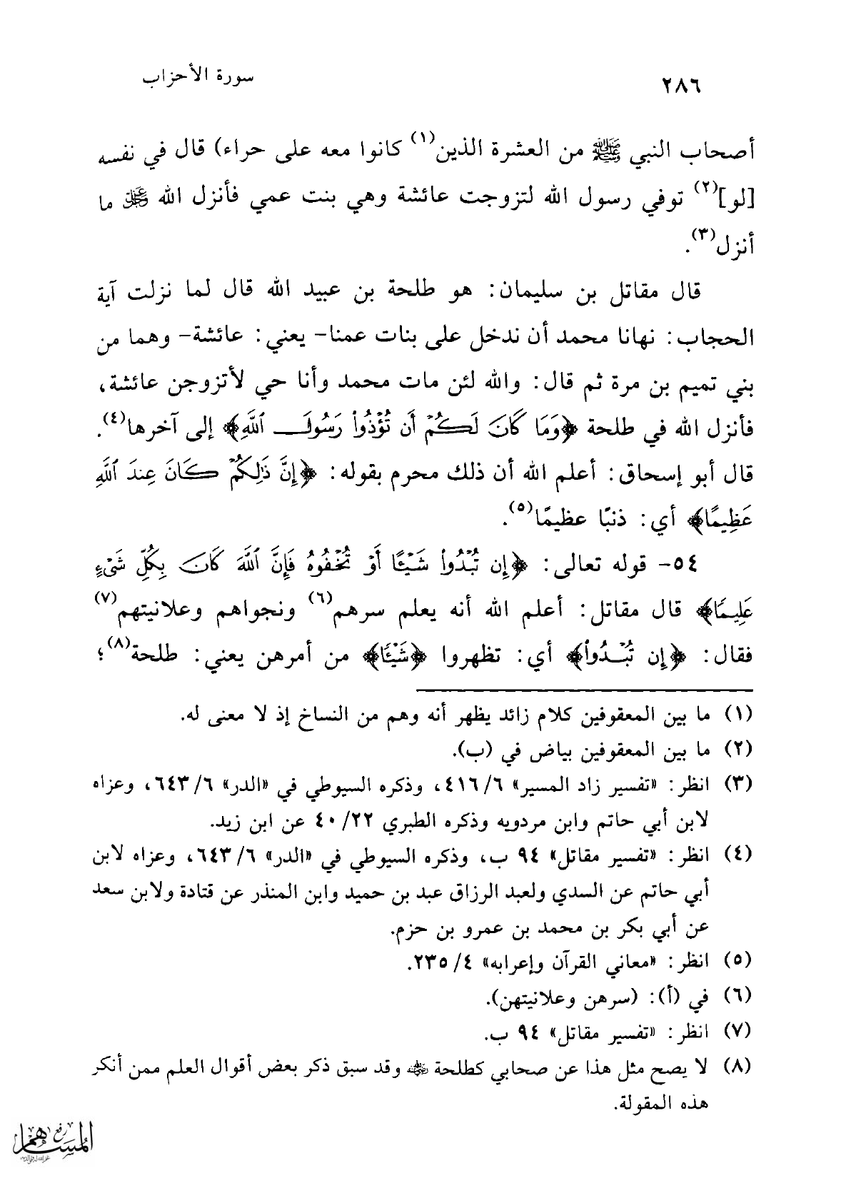 54 - قوله تعالى: {إِنْ تُبْدُوا شَيْئًا أَوْ تُخْفُوهُ فَإِنَّ اللَّهَ كَانَ بِكُلِّ شَيْءٍ عَلِيمًا} قال مقاتل: أعلم الله أنه يعلم سرهم (¬6) ونجواهم وعلانيتهم (¬7) فقال: {إِنْ تُبْدُوا} أي: تظهروا {شَيْئًا} من أمرهن يعني: طلحة (¬8)؛