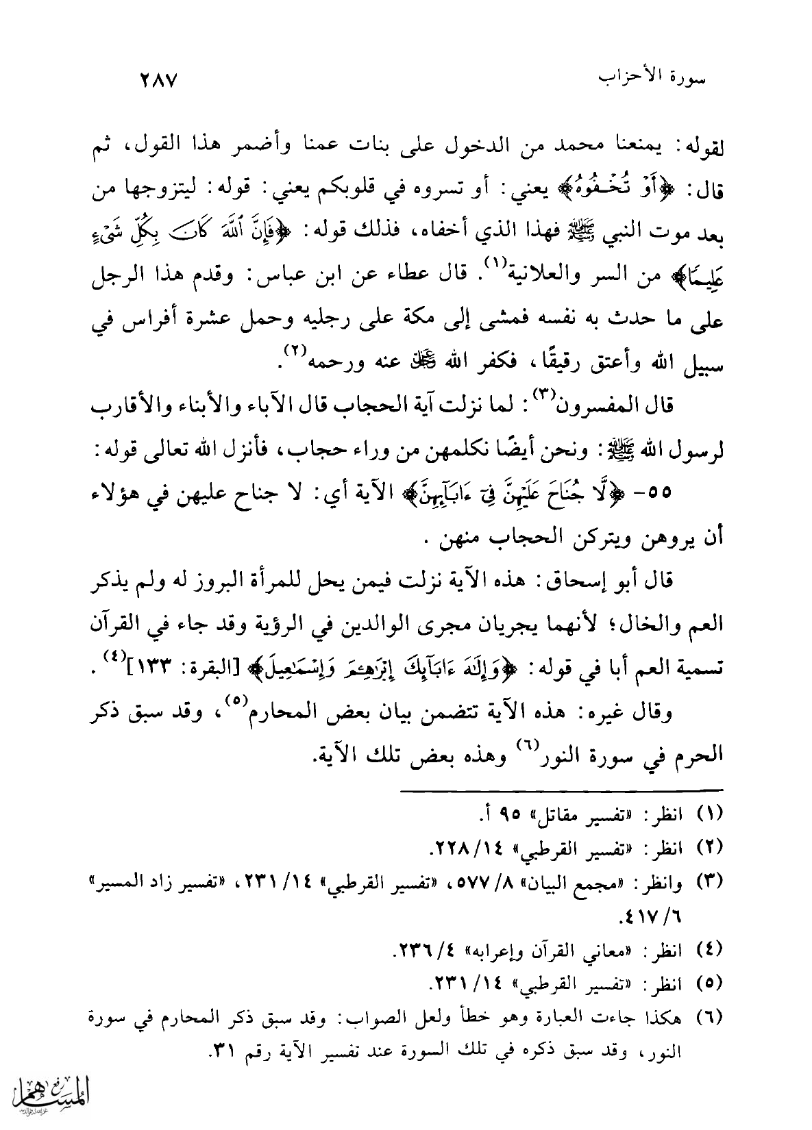 (¬6) هكذا جاءت العبارة وهو خطأ ولعل الصواب: وقد سبق ذكر المحارم في سورة النور، وقد سبق ذكره في تلك السورة عند تفسير الآية رقم 31.