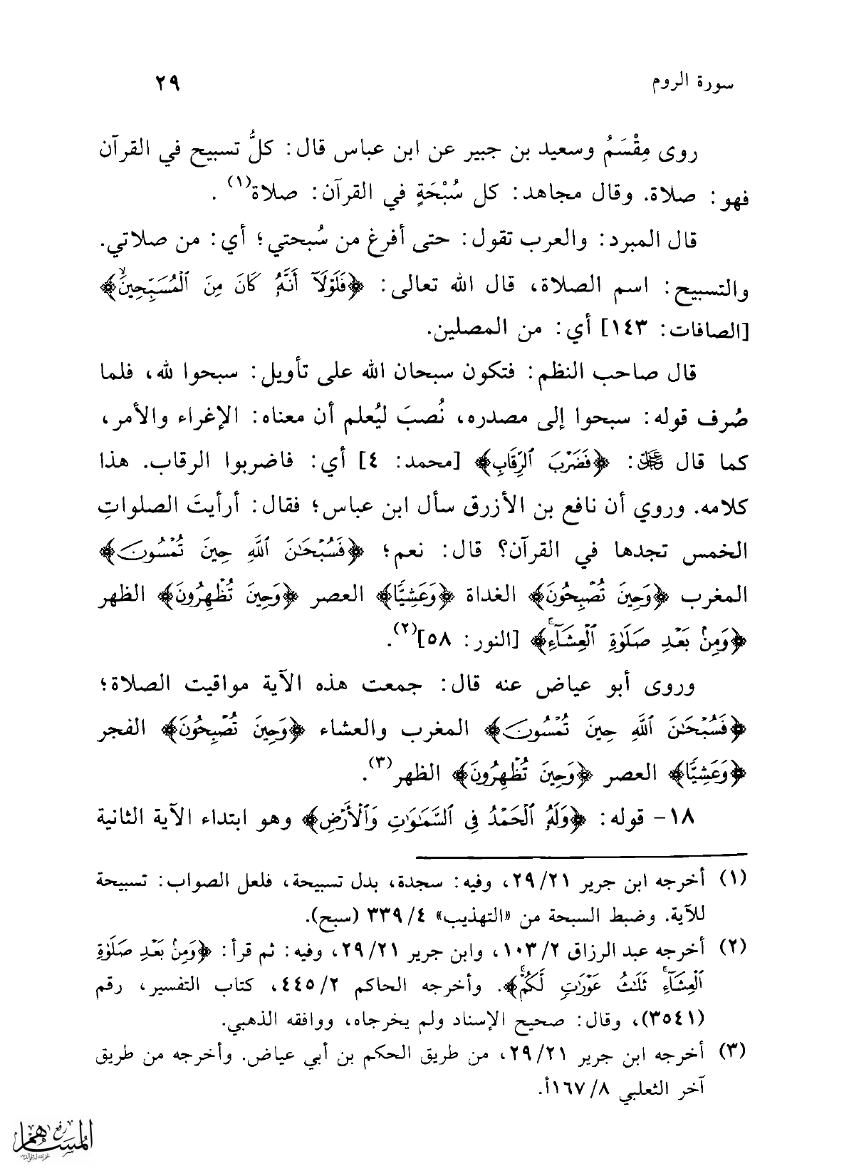 روى مِقْسَمُ وسعيد بن جبير عن ابن عباس قال: كلُّ تسبيح في القرآن فهو: صلاة. وقال مجاهد: كل سُبْحَةٍ في القرآن: صلاة (¬1).