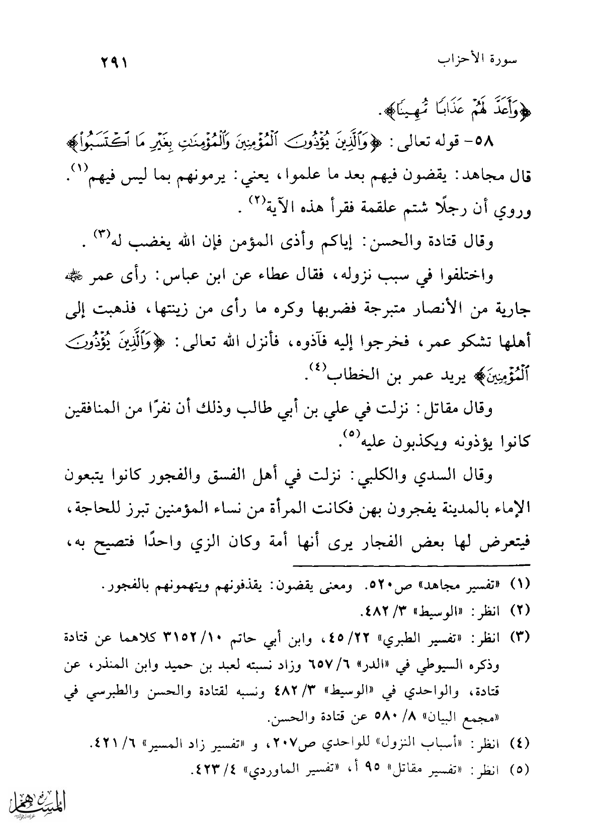 واختلفوا في سبب نزوله، فقال عطاء عن ابن عباس: رأى عمر -رضي الله عنه- جارية من الأنصار متبرجة فضربها وكره ما رأى من زينتها، فذهبت إلى أهلها تشكو عمر، فخرجوا إليه فآذوه، فأنزل الله تعالى: {وَالَّذِينَ يُؤْذُونَ الْمُؤْمِنِينَ} يريد عمر بن الخطاب (¬4).