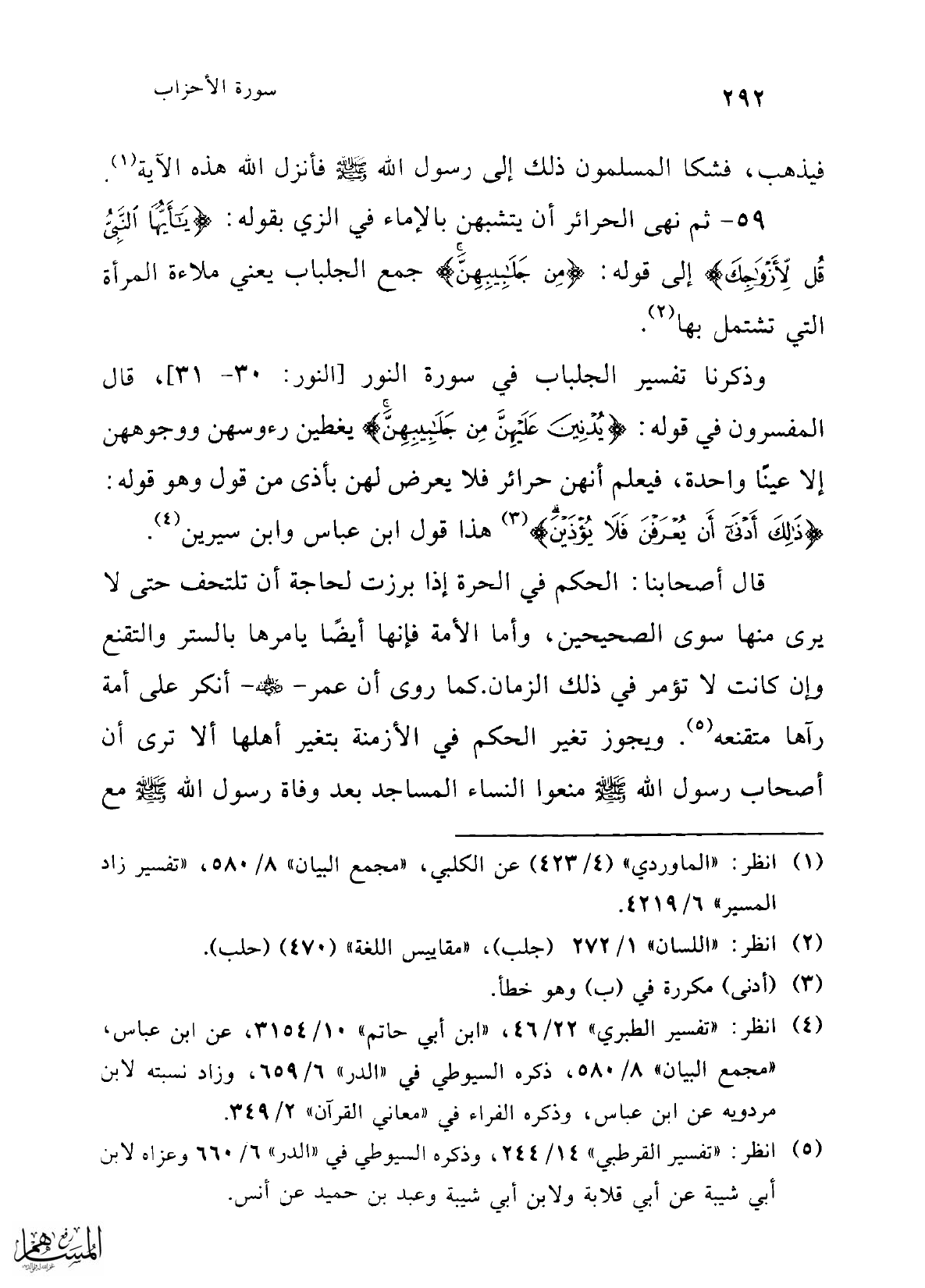 وذكرنا تفسير الجلباب في سورة النور [النور: 30 - 31]، قال المفسرون في قوله: {يُدْنِينَ عَلَيْهِنَّ مِنْ جَلَابِيبِهِنَّ} يغطين رءوسهن ووجوههن إلا عينًا واحدة، فيعلم أنهن حرائر فلا يعرض لهن بأذى من قول وهو قوله: {ذَلِكَ أَدْنَى أَنْ يُعْرَفْنَ فَلَا يُؤْذَيْنَ} (¬3) هذا قول ابن عباس وابن سيرين (¬4).