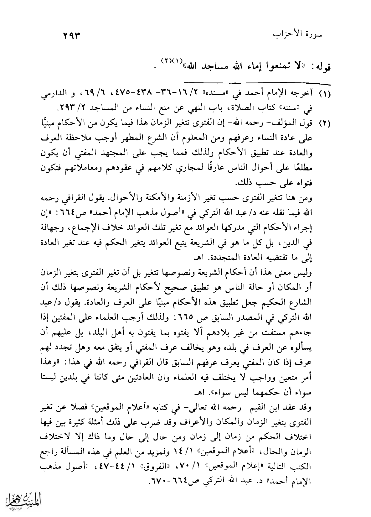 وليس معنى هذا أن أحكام الشريعة ونصوصها تتغير بل أن تغير الفتوى بتغير الزمان أو المكان أو حالة الناس هو تطبيق صحيح لأحكام الشريعة ونصوصها ذلك أن الشارع الحكيم جعل تطبيق هذه الأحكام مبنيًا على العرف والعادة. يقول د/ عبد الله التركي في المصدر السابق ص 665: ولذلك أوجب العلماء على المفتين إذا جاءهم مستفت من غير بلادهم ألا يفتوه بما يفتون به أهل البلد، بل عليهم أن يسألوه عن العرف في بلده وهو يخالف عرف المفتي أو يتفق معه وهل تجدد لهم عرف إذا كان المفتي يعرف عرفهم السابق قال القرافي رحمه الله في هذا: "وهذا أمر متعين وواجب لا يختلف فيه العلماء وإن العادتين متى كانتا في بلدين ليستا سواء أن حكمهما ليس سواء". اهـ.