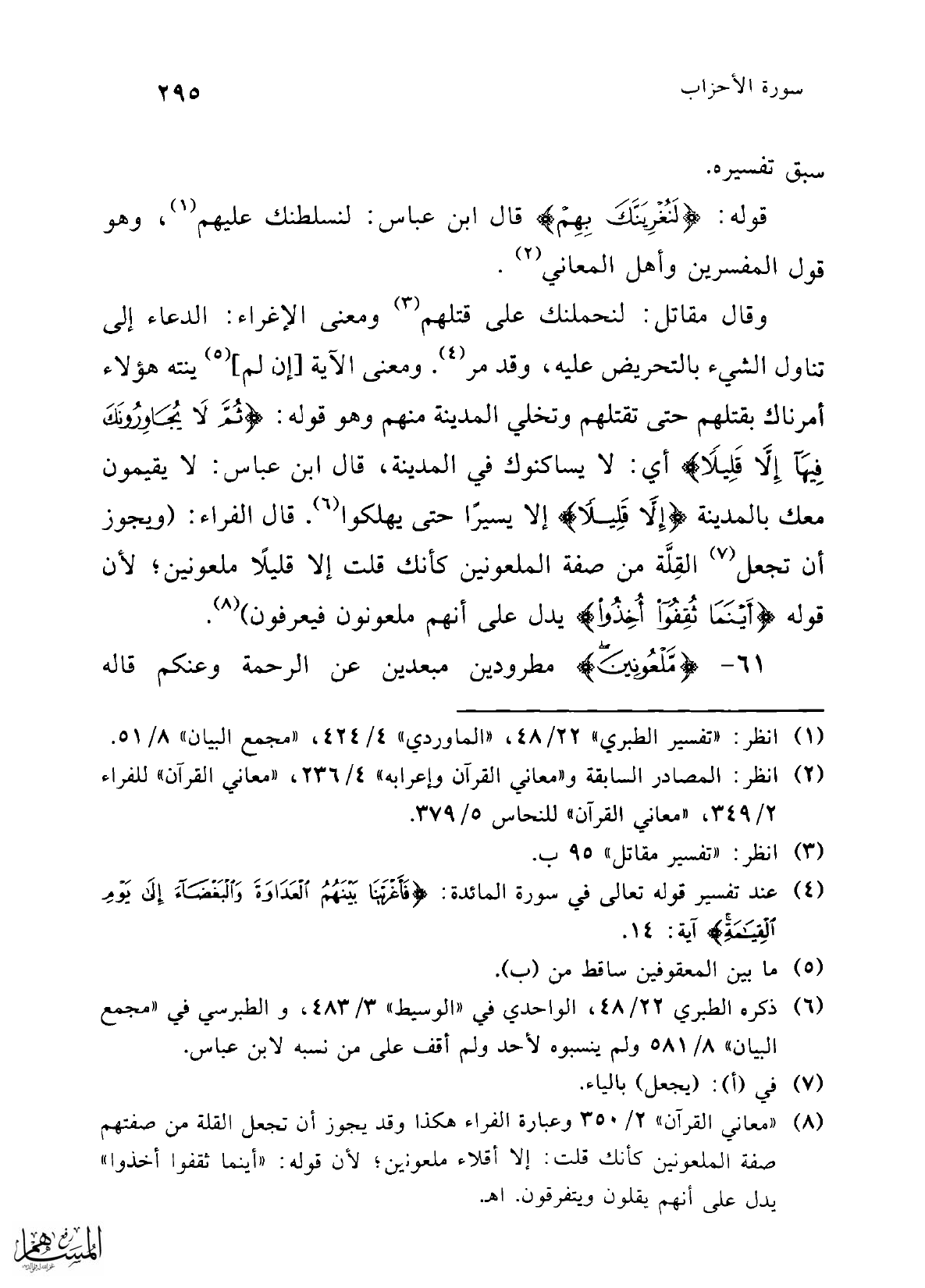 (¬8) "معاني القرآن" 2/ 350 وعبارة الفراء هكذا وقد يجوز أن تجعل القلة من صفتهم صفة الملعونين كأنك قلت: إلا أقلاء ملعونين؛ لأن قوله: "أينما ثقفوا أخذوا" يدك على أنهم يقلون ويتفرقون. اهـ.