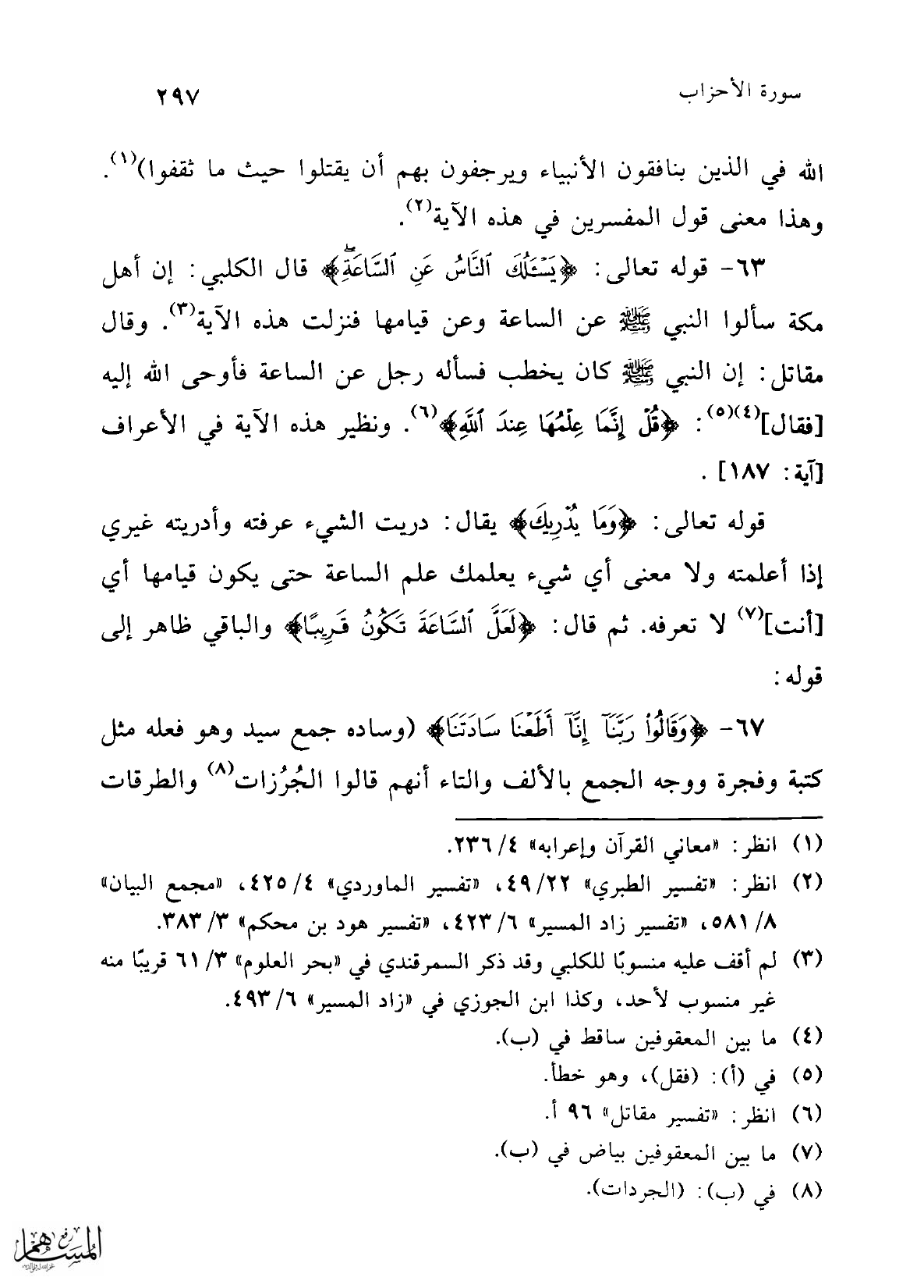 63 - قوله تعالى: {يَسْأَلُكَ النَّاسُ عَنِ السَّاعَةِ} قال الكلبي: إن أهل مكة سألوا النبي -صلى الله عليه وسلم- عن الساعة وعن قيامها فنزلت هذه الآية (¬3). وقال مقاتل: إن النبي -صلى الله عليه وسلم- كان يخطب فسأله رجل عن الساعة فأوحى الله إليه [فقال] (¬4) (¬5): {قُلْ إِنَّمَا عِلْمُهَا عِنْدَ اللَّهِ} (¬6). ونظير هذه الآية في الأعراف [آية: 187].