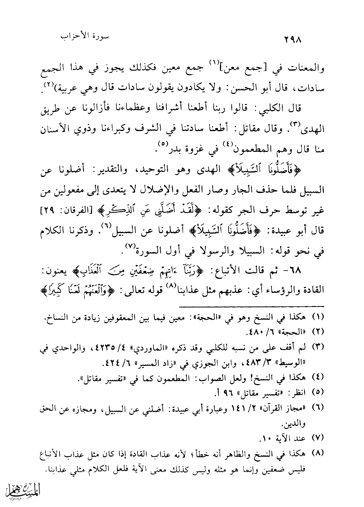 {فَأَضَلُّونَا السَّبِيلَا} الهدى وهو التوحيد، والتقدير: أضلونا عن السبيل فلما حذف الجار وصار الفعل والإضلال لا يتعدى إلى مفعولين من غير توسط حرف الجر كقوله: {لَقَدْ أَضَلَّنِي عَنِ الذِّكْرِ} [الفرقان: 29] قال أبو عبيدة: {فَأَضَلُّونَا السَّبِيلَا} أضلونا عن السبيل (¬6). وذكرنا الكلام في نحو قوله: السبيلا والرسولا في أول السورة (¬7).