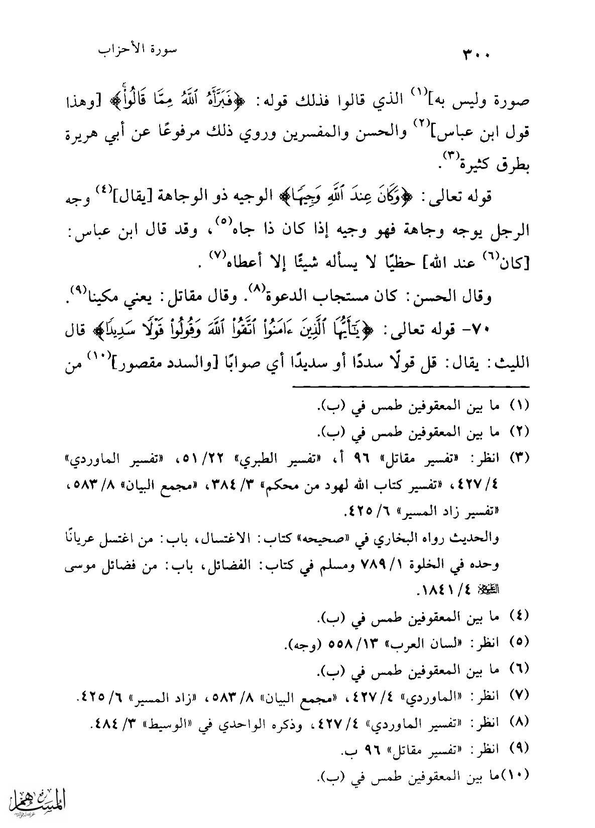 (¬3) انظر: "تفسير مقاتل" 96 أ، "تفسير الطبري" 22/ 51، "تفسير الماوردي" 4/ 427، "تفسير كتاب الله لهود من محكم" 3/ 384، "مجمع البيان" 8/ 583، "تفسير زاد المسير" 6/ 425.