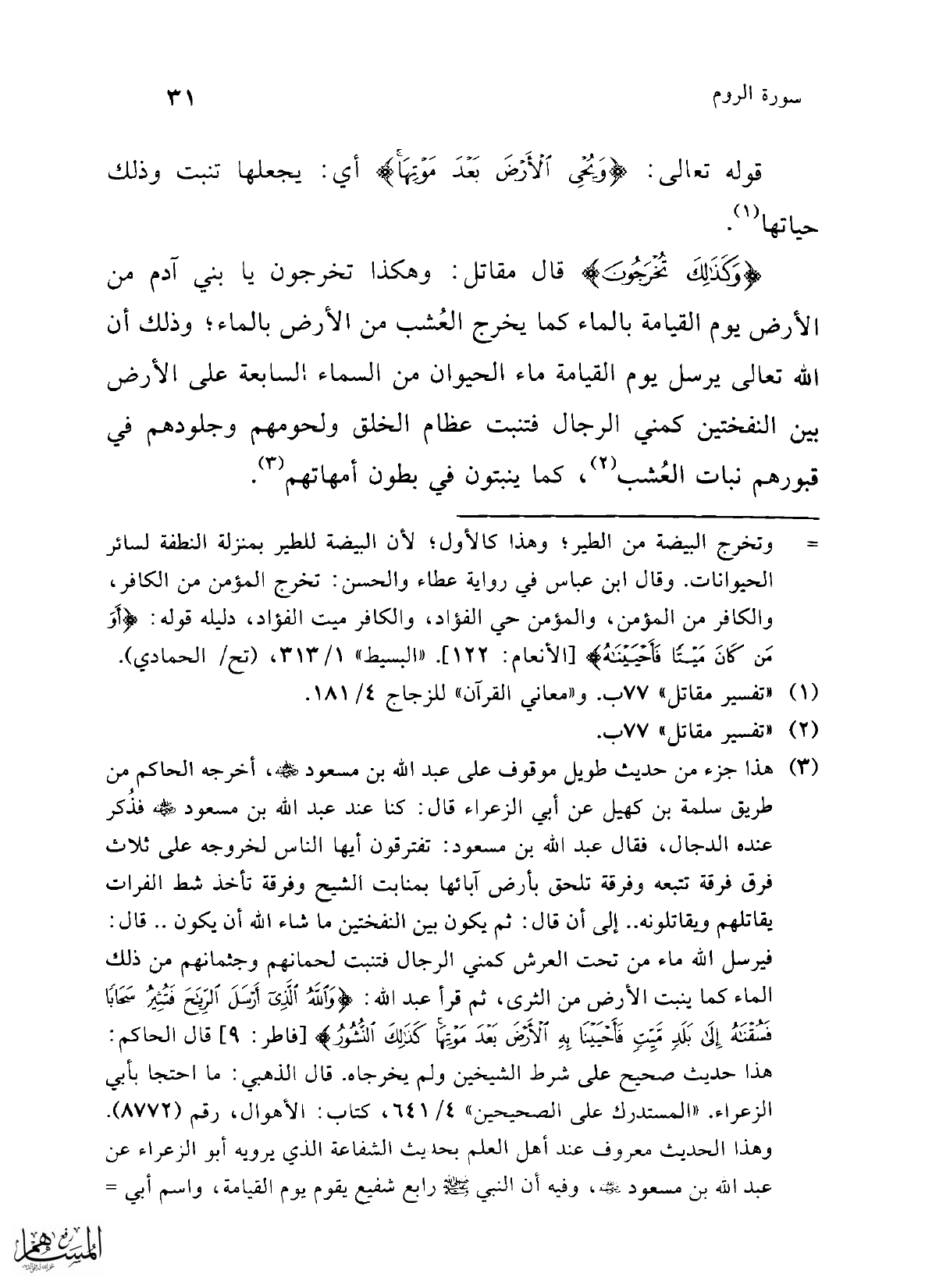 (¬3) هذا جزء من حديث طويل موقوف على عبد الله بن مسعود -رضي الله عنه-، أخرجه الحاكم من طريق سلمة بن كهيل عن أبي الزعراء قال: كنا عند عبد الله بن مسعود -رضي الله عنه- فذُكر عنده الدجال، فقال عبد الله بن مسعود: تفترقون أيها الناس لخروجه على ثلاث فرق فرقة تتبعه وفرقة تلحق بأرض آبائها بمنابت الشيح وفرقة تأخذ شط الفرات يقاتلهم ويقاتلونه .. إلى أن قال: ثم يكون بين النفختين ما شاء الله أن يكون .. قال: فيرسل الله ماء من تحت العرش كمني الرجال فتنبت لحمانهم وجثمانهم من ذلك الماء كما ينبت الأرض من الثرى، ثم قرأ عبد الله: {وَاللَّهُ الَّذِي أَرْسَلَ الرِّيَاحَ فَتُثِيرُ سَحَابًا فَسُقْنَاهُ إِلَى بَلَدٍ مَيِّتٍ فَأَحْيَيْنَا بِهِ الْأَرْضَ بَعْدَ مَوْتِهَا كَذَلِكَ النُّشُورُ} [فاطر: 9] قال الحاكم: هذا حديث صحيح على شرط الشيخين ولم يخرجاه. قال الذهبي: ما احتجا بأبي الزعراء. "المستدرك على الصحيحين" 4/ 641، كتاب: الأهوال، رقم (8772). وهذا الحديث معروف عند أهل العلم بحديث الشفاعة الذي يرويه أبو الزعراء عن عبد الله بن مسعود -رضي الله عنه-، وفيه أن النبي -صلى الله عليه وسلم- رابع شفيع يقوم يوم القيامة، واسم أبي =