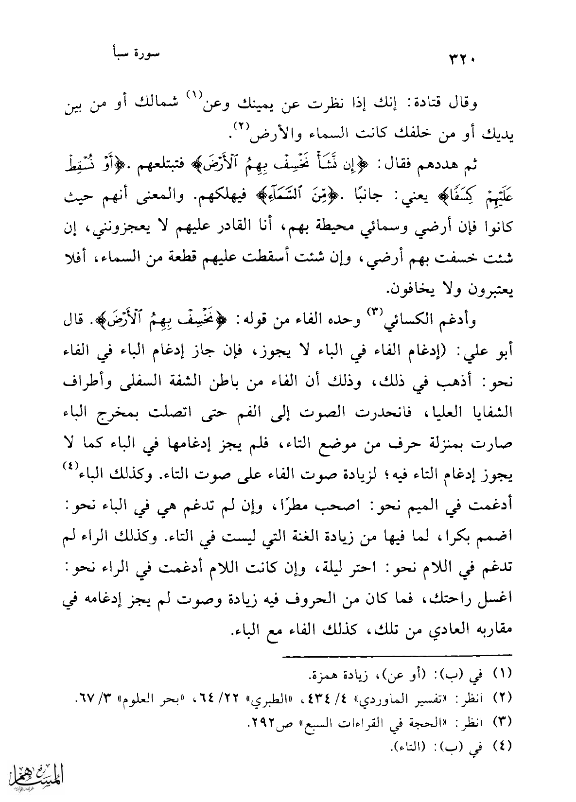 وأدغم الكسائي (¬3) وحده الفاء من قوله: {نَخْسِفْ بِهِمُ الْأَرْضَ}. قال أبو علي: (إدغام الفاء في الباء لا يجوز، فإن جاز إدغام الباء في الفاء نحو: أذهب في ذلك، وذلك أن الفاء من باطن الشفة السفلى وأطراف الشفايا العليا، فانحدرت الصوت إلى الفم حتى اتصلت بمخرج الباء صارت بمنزلة حرف من موضع التاء، فلم يجز إدغامها في الباء كما لا يجوز إدغام التاء فيه؛ لزيادة صوت الفاء على صوت التاء. وكذلك الباء (¬4) أدغمت في الميم نحو: اصحب مطرًا، وإن لم تدغم هي في الباء نحو: اضمم بكرا، لما فيها من زيادة الغنة التي ليست في التاء. وكذلك الراء لم تدغم في اللام نحو: احتر ليلة، وإن كانت اللام أدغمت في الراء نحو: اغسل راحتك، فما كان من الحروف فيه زيادة وصوت لم يجز إدغامه في مقاربه العادي من تلك، كذلك الفاء مع الباء.