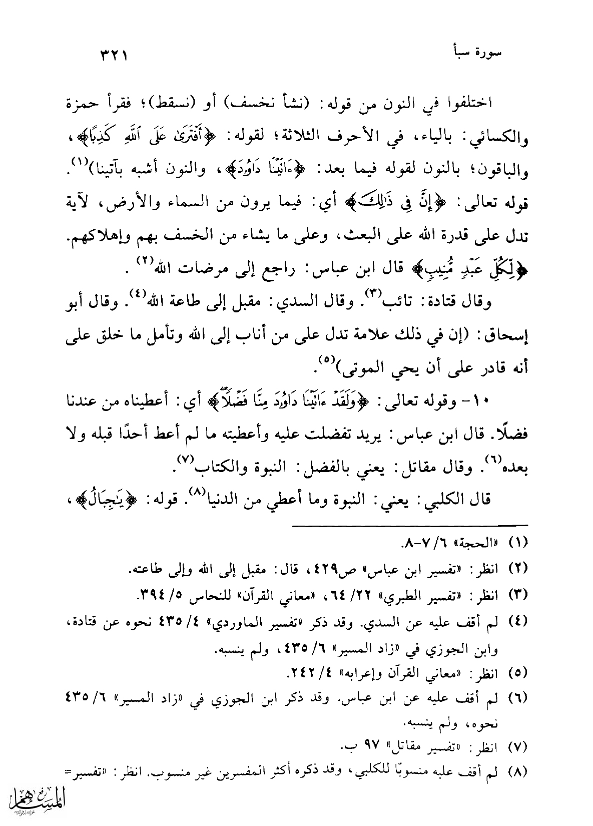 اختلفوا في النون من قوله: (نشأ نخسف) أو (نسقط)؛ فقرأ حمزة والكسائي: بالياء، في الأحرف الثلاثة؛ لقوله: {أَفْتَرَى عَلَى اللَّهِ كَذِبًا}، والباقون؛ بالنون لقوله فيما بعد: {آتَيْنَا دَاوُودَ}، والنون أشبه بآتينا) (¬1). قوله تعالى: {إِنَّ فِي ذَلِكَ} أي: فيما يرون من السماء والأرض، لآية تدل على قدرة الله على البعث، وعلى ما يشاء من الخسف بهم وإهلاكهم. {لِكُلِّ عَبْدٍ مُنِيبٍ} قال ابن عباس: راجع إلى مرضات الله (¬2).