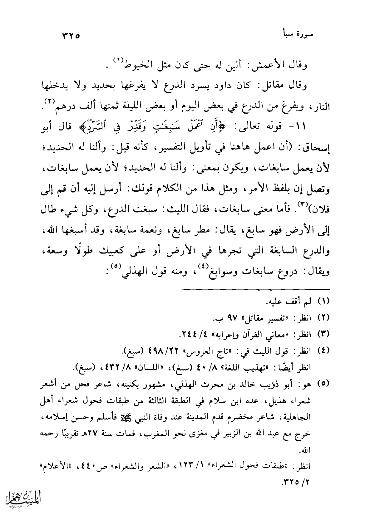 11 - قوله تعالى: {أَنِ اعْمَلْ سَابِغَاتٍ وَقَدِّرْ فِي السَّرْدِ} قال أبو إسحاق: (أن اعمل هاهنا في تأويل التفسير، كأنه قيل: وألنا له الحديد؛ لأن يعمل سابغات، ويكون بمعنى: وألنا له الحديد؛ لأن يعمل سابغات، وتصل إن بلفظ الأمر، ومثل هذا من الكلام قولك: أرسل إليه أن قم إلى فلان) (¬3). فأما معنى سابغات، فقال الليث: سبغت الدرع، وكل شيء طال إلى الأرض فهو سابغ، يقال: مطر سابغ، ونعمة سابغة، وقد أسبغها الله، والدرع السابغة التي تجرها في الأرض أو على كعبيك طولًا وسعة، ويقال: دروع سابغات وسوابغ (¬4)، ومنه قول الهذلي (¬5):