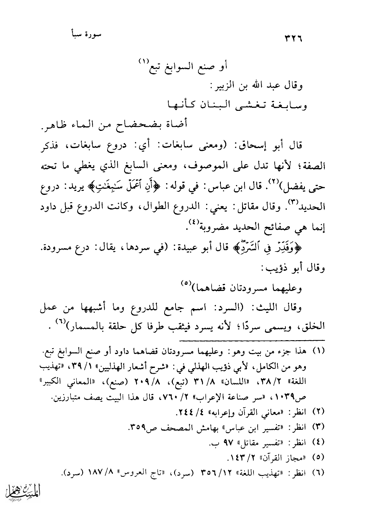 قال أبو إسحاق: (ومعنى سابغات: أي: دروع سابغات، فذكر الصفة؛ لأنها تدل على الموصوف، ومعنى السابغ الذي يغطي بما تحته حتى يفضل) (¬2). قال ابن عباس: في قوله: {أَنِ اعْمَلْ سَابِغَاتٍ} يريد: دروع الحديد (¬3). وقال مقاتل: يعني: الدروع الطوال، وكانت الدروع قبل داود إنما هي صفائح الحديد مضروبة (¬4).