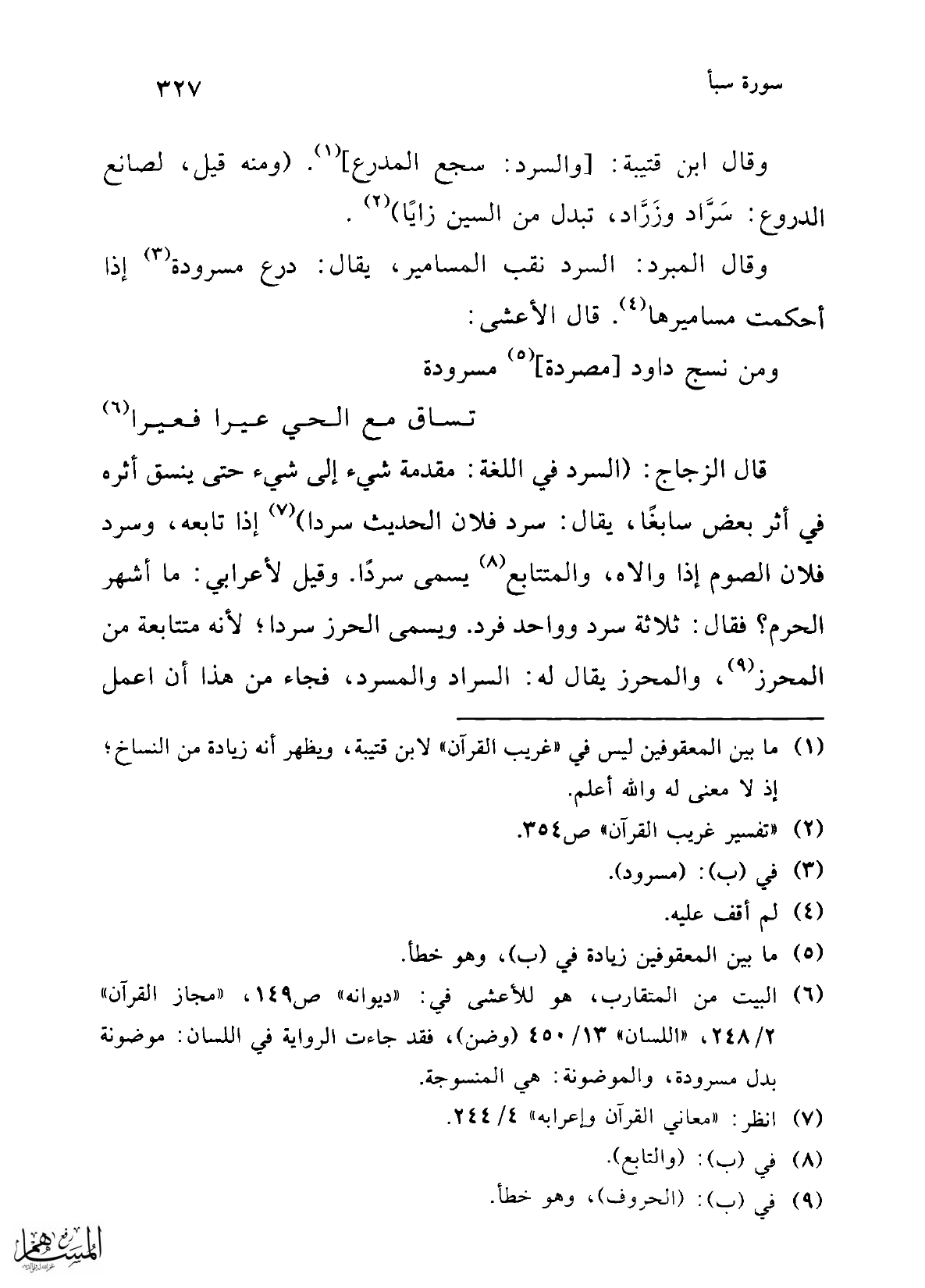 وقال المبرد: السرد نقب المسامير، يقال: درع مسرودة (¬3) إذا أحكمت مساميرها (¬4). قال الأعشى: