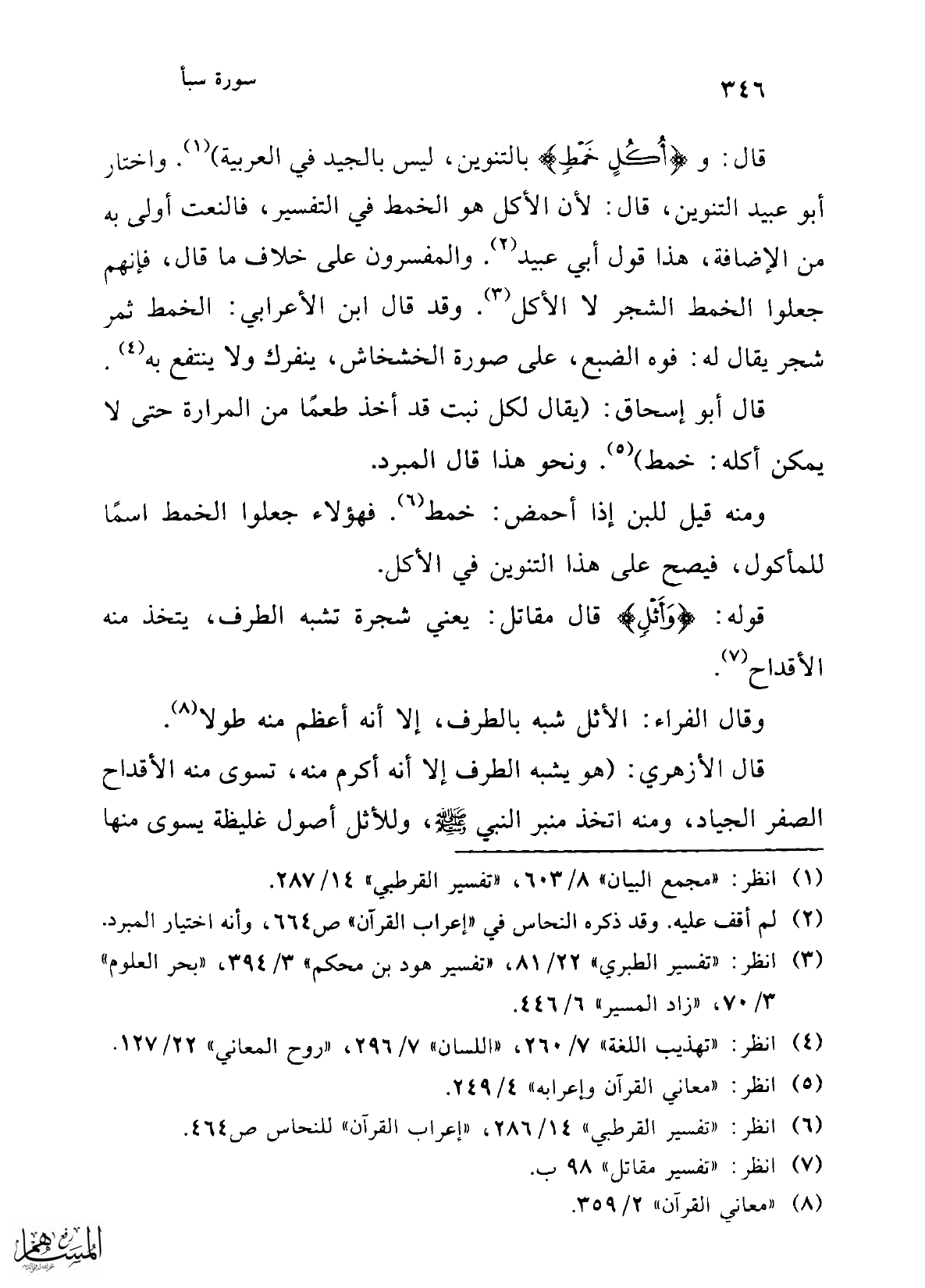 قال: و {أُكُلٍ خَمْطٍ} بالتنوين، ليس بالجيد في العربية) (¬1). واختار أبو عبيد التنوين، قال: لأن الأكل هو الخمط في التفسير، فالنعت أولى به من الإضافة، هذا قول أبي عبيد (¬2). والمفسرون على خلاف ما قال، فإنهم جعلوا الخمط الشجر لا الأكل (¬3). وقد قال ابن الأعرابي: الخمط ثمر شجر يقال له: فوه الضبع، على سورة الخشخاش، ينفرك ولا ينتفع به (¬4).