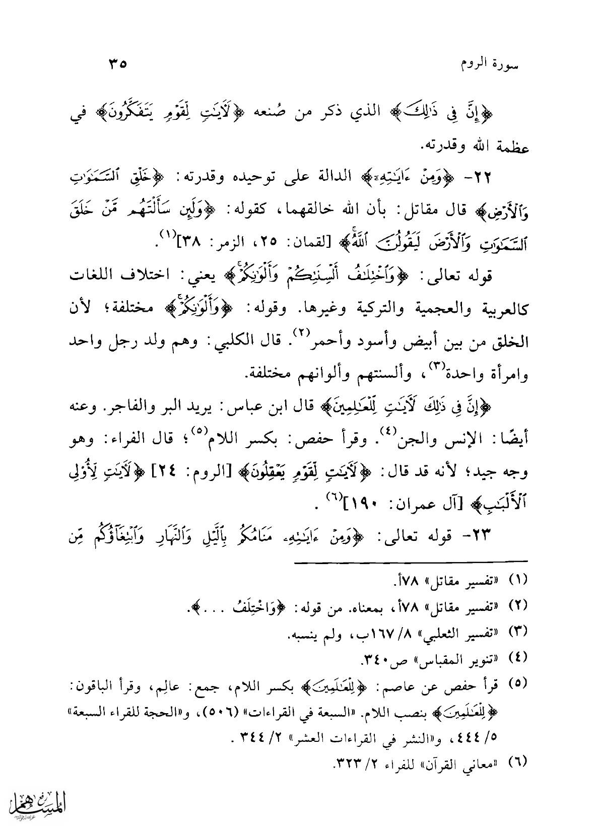 قوله تعالى: {وَاخْتِلَافُ أَلْسِنَتِكُمْ وَأَلْوَانِكُمْ} يعني: اختلاف اللغات كالعربية والعجمية والتركية وغيرها. وقوله: {وَأَلْوَانِكُمْ} مختلفة؛ لأن الخلق من بين أبيض وأسود وأحمر (¬2). قال الكلبي: وهم ولد رجل واحد وامرأة واحدة (¬3)، وألسنتهم وألوانهم مختلفة.