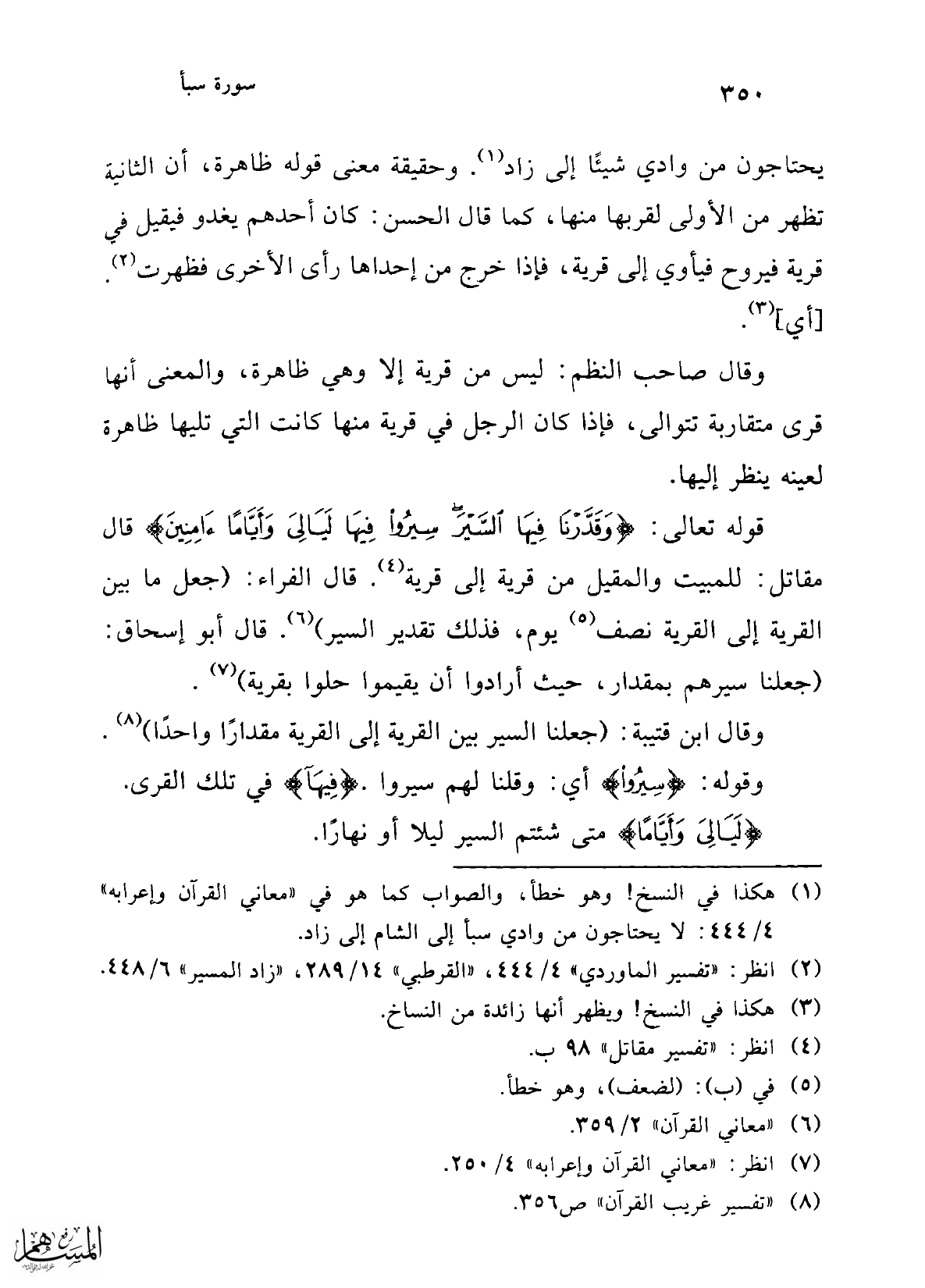 (¬1) هكذا في النسخ! وهو خطأ، والصواب كما هو في "معاني القرآن وإعرابه" 4/ 444: لا يحتاجون من وادي سبأ إلى الشام إلى زاد.