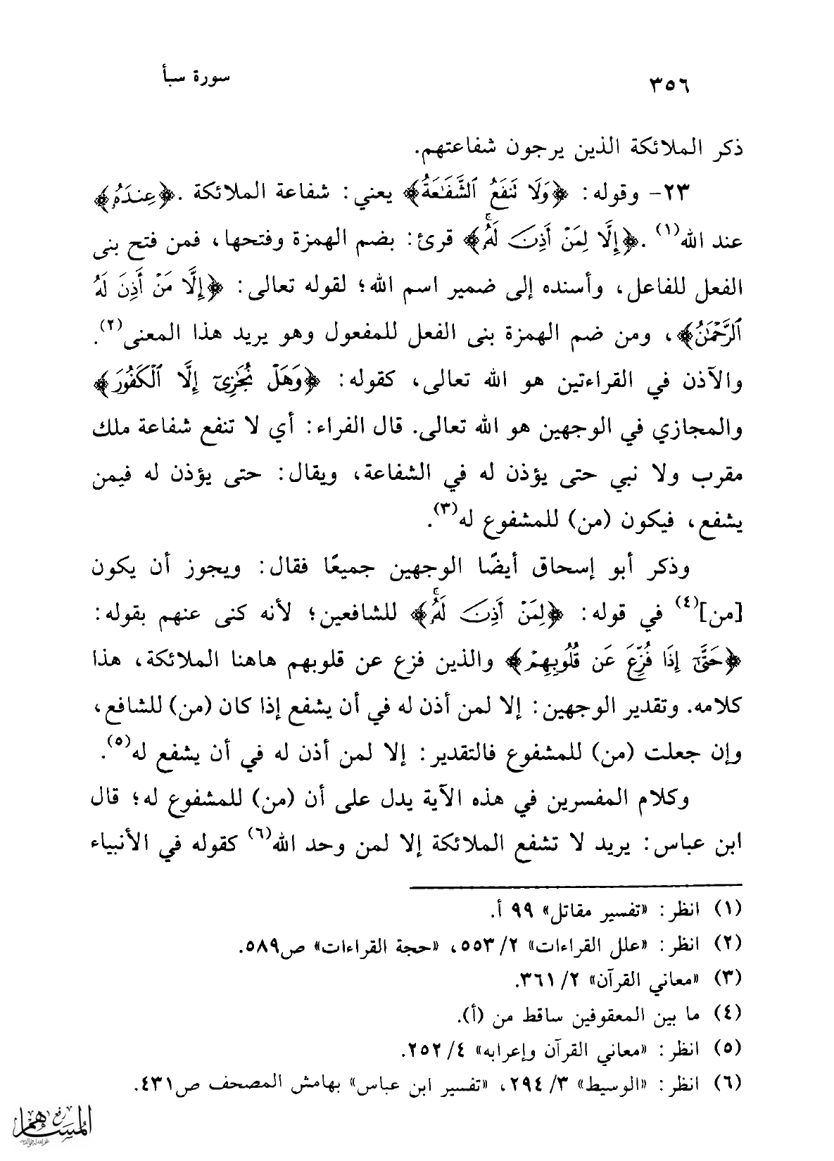 23 - وقوله: {وَلَا تَنْفَعُ الشَّفَاعَةُ} يعني: شفاعة الملائكة. {عِنْدَهُ} عند الله (¬1). {إِلَّا لِمَنْ أَذِنَ لَهُ} قرئ: بضم الهمزة وفتحها، فمن فتح بني الفعل للفاعل، وأسنده إلى ضمير اسم الله؛ لقوله تعالى: {لَّا مَنْ أَذِنَ لَهُ الرَّحْمَنُ}، ومن ضم الهمزة بني الفعل للمفعول وهو يريد هذا المعنى (¬2). والآذن في القراءتين هو الله تعالى، كقوله: {وَهَلْ نُجَازِي إِلَّا الْكَفُورَ} والمجازي في الوجهين هو الله تعالى. قال الفراء: أي لا تنفع شفاعة ملك مقرب ولا نبي حتى يؤذن له في الشفاعة، ويقال: حتى يؤذن له فيمن يشفع، فيكون (من) للمشفوع له (¬3).