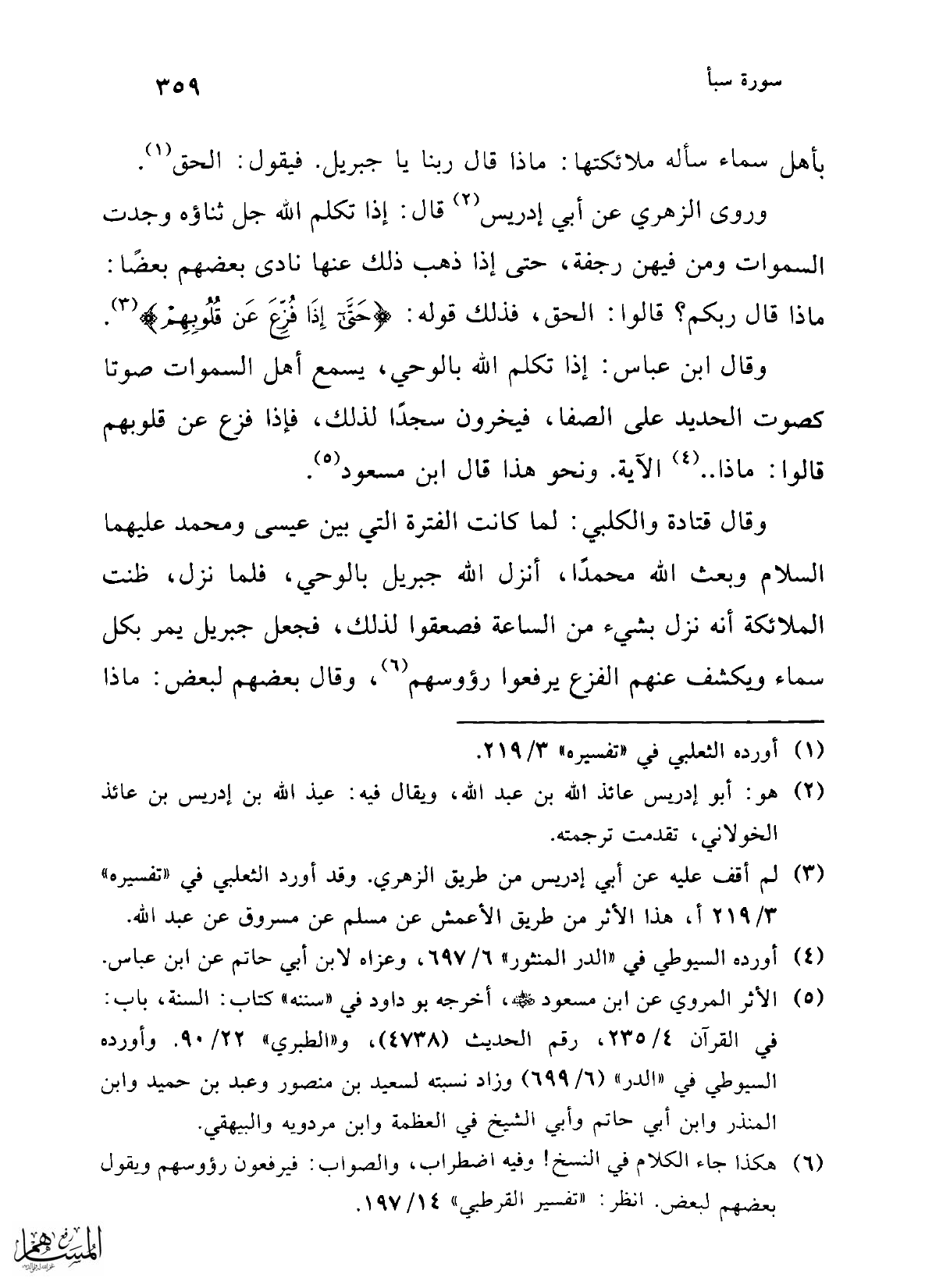 وقال ابن عباس: إذا تكلم الله بالوحي، يسمع أهل السموات صوتا كصوت الحديد على الصفا، فيخرون سجدًا لذلك، فإذا فزع عن قلوبهم قالوا: ماذا ... (¬4) الآية. ونحو هذا قال ابن مسعود (¬5).