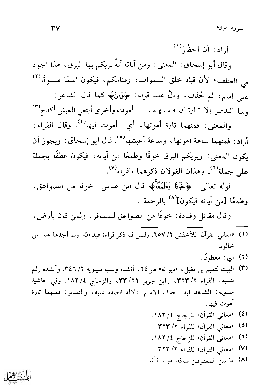 وقال أبو إسحاق: المعنى: ومن آياته آيةٌ يريكم بها البرق، هذا أجود في العطف؛ لأن قبله خلق السموات، ومنامكم، فيكون اسمًا منسوقًا (¬2) علي اسم، ثم حُذف، ودلَّ عليه قوله: {وَمِنَ} كما قال الشاعر: