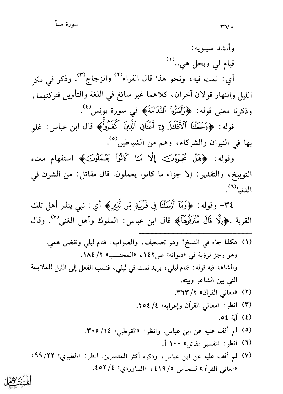 34 - وقوله: {وَمَا أَرْسَلْنَا فِي قَرْيَةٍ مِنْ نَذِيرٍ} أي: نبي ينذر أهل تلك القرية {إِلَّا قَالَ مُتْرَفُوهَا} قال ابن عباس: الملوك وأهل الغنى (¬7). وقال