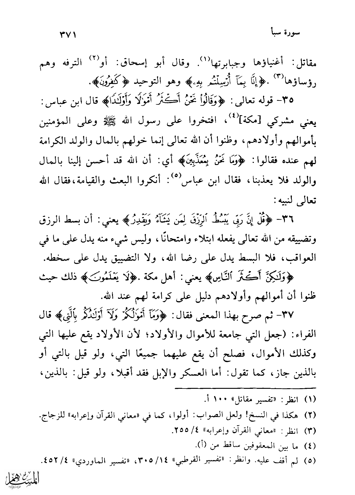 37 - ثم صرح بهذا المعنى فقال: {وَمَا أَمْوَالُكُمْ وَلَا أَوْلَادُكُمْ} قال الفراء: (جعل التي جامعة للأموال والأولاد؛ لأن الأولاد يقع عليها التي وكذلك الأموال، فصلح أن يقع عليهما جميعًا التي، ولو قيل بالتي أو بالذين جاز، كما تقول: أما العسكر والإبل فقد أقبلا، ولو قيل: بالذين،