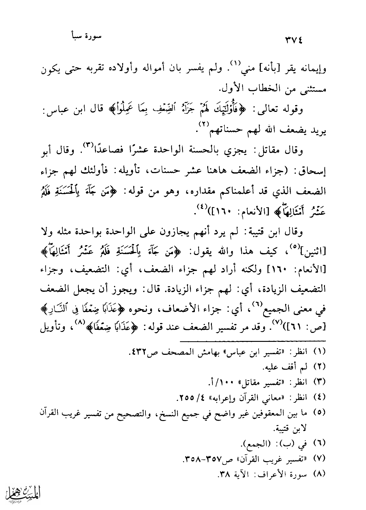 وقال مقاتل: يجزي بالحسنة الواحدة عشرًا فصاعدًا (¬3) وقال أبو إسحاق: (جزاء الضعف هاهنا عشر حسنات، تأويله: فأولئك لهم جزاء الضعف الذي قد أعلمناكم مقداره، وهو من قوله: {مَنْ جَاءَ بِالْحَسَنَةِ فَلَهُ عَشْرُ أَمْثَالِهَا} [الأنعام: 160]) (¬4).