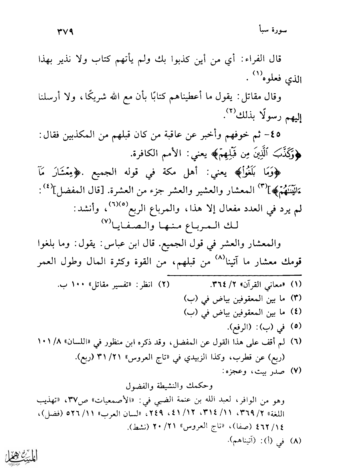 {وَمَا بَلَغُوا} يعني: أهل مكة في قوله الجميع. {مِعْشَارَ مَا آتَيْنَاهُمْ}] (¬3) المعشار والعشير والعشر جزء من العشرة. [قال المفضل] (¬4): لم يرد في العدد مفعال إلا هذا، والمرباع الربع (¬5) (¬6)، وأنشد:
