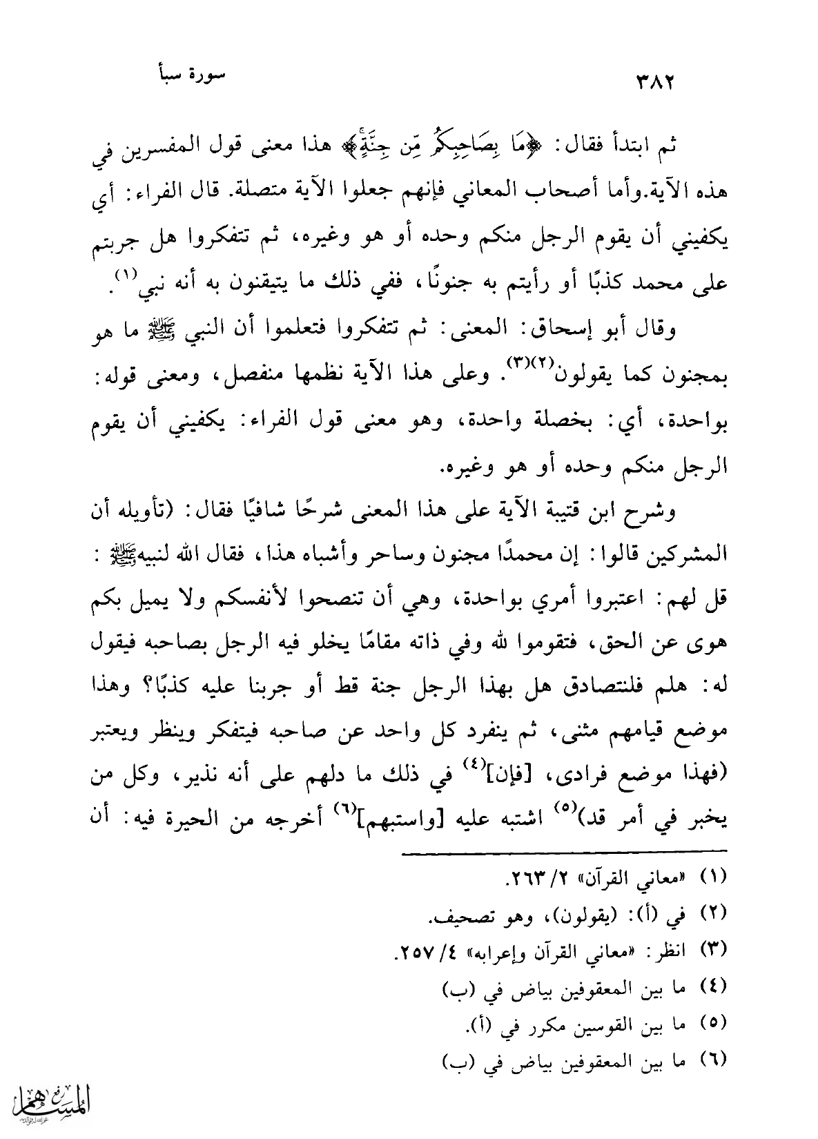 ثم ابتدأ فقال: {مَا بِصَاحِبِكُمْ مِنْ جِنَّةٍ} هذا معنى قول المفسرين في هذه الآية. وأما أصحاب المعاني فإنهم جعلوا الآية متصلة. قال الفراء: أي يكفيني أن يقوم الرجل منكم وحده أو هو وغيره، ثم تتفكروا هل جربتم على محمد كذبًا أو رأيتم به جنونًا، ففي ذلك ما يتيقنون به أنه بني (¬1).