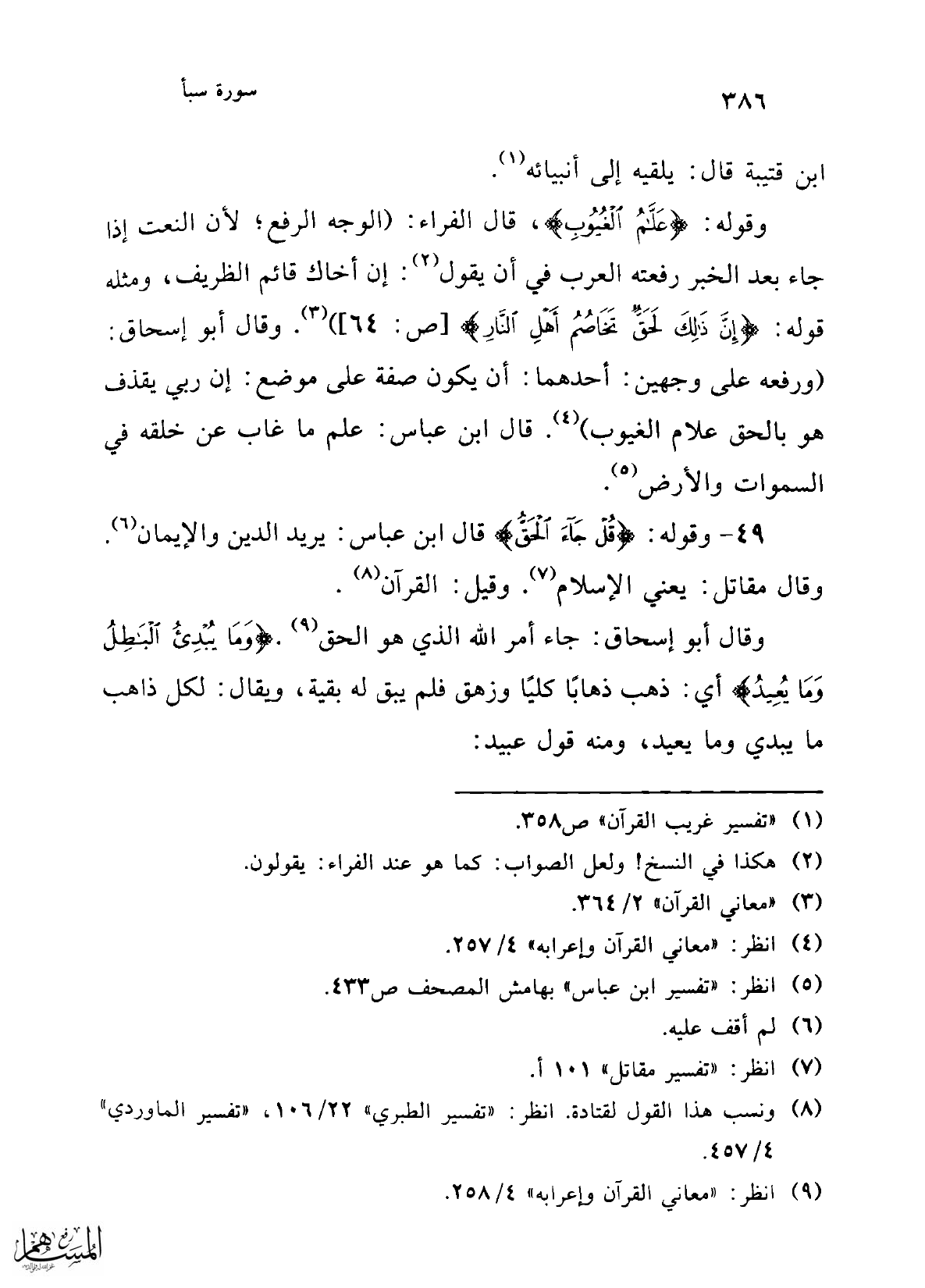 وقوله: {عَلَّامُ الْغُيُوبِ}، قال الفراء: (الوجه الرفع؛ لأن النعت إذا جاء بعد الخبر رفعته العرب في أن يقول (¬2): إن أخاك قائم الظريف، ومثله قوله: {إِنَّ ذَلِكَ لَحَقٌّ تَخَاصُمُ أَهْلِ النَّارِ} [ص: 64]) (¬3). وقال أبو إسحاق: (ورفعه على وجهين: أحدهما: أن يكون صفة على موضع: إن ربي يقذف هو بالحق علام الغيوب) (¬4). قال ابن عباس: علم ما غاب عن خلقه في السموات والأرض (¬5).
