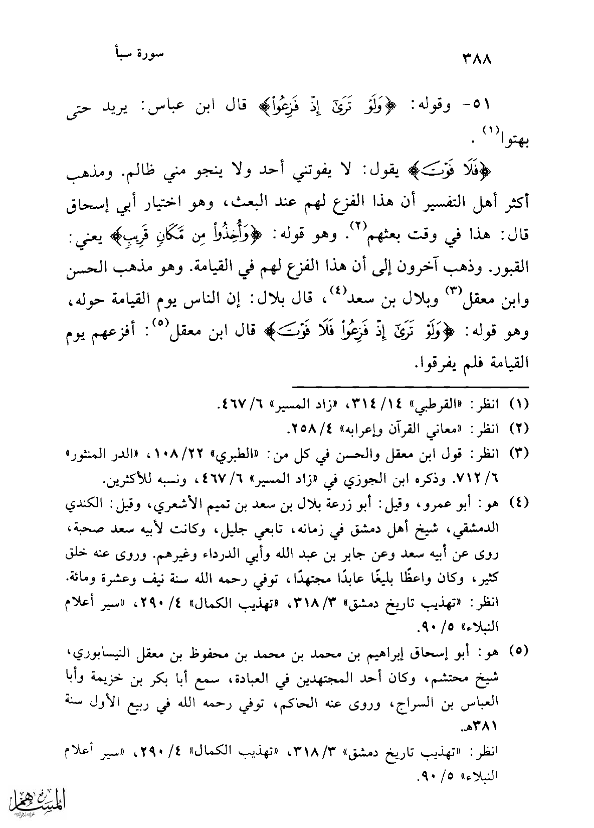 51 - وقوله: {وَلَوْ تَرَى إِذْ فَزِعُوا} قال ابن عباس: يريد حتى بهتوا (¬1).