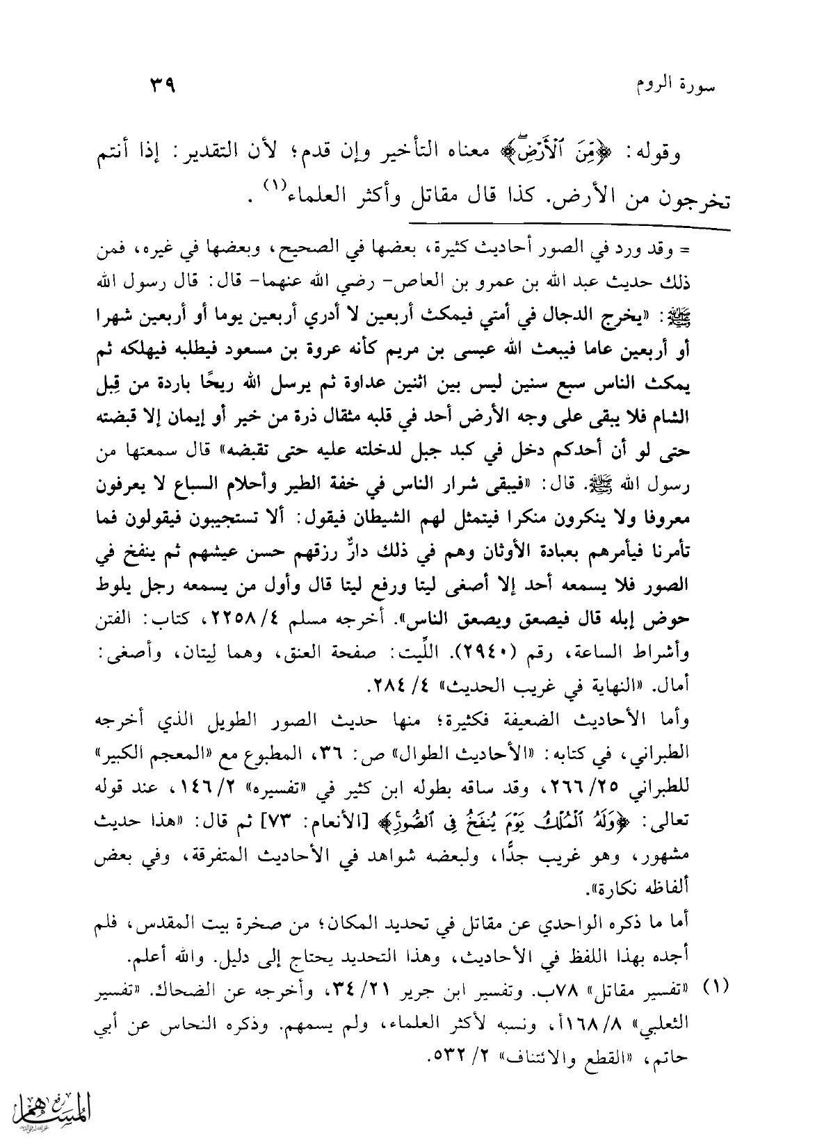 = وقد ورد في الصور أحاديث كثيرة، بعضها في الصحيح، وبعضها في غيره، فمن ذلك حديث عبد الله بن عمرو بن العاص -رضي الله عنهما- قال: قال رسول الله -صلى الله عليه وسلم-: "يخرج الدجال في أمتي فيمكث أربعين لا أدري أربعين يوما أو أربعين شهرا أو أربعين عاما فيبعث الله عيسى بن مريم كأنه عروة بن مسعود فيطلبه فيهلكه ثم يمكث الناس سبع سنين ليس بين اثنين عداوة ثم يرسل الله ريحًا باردة من قِبل الشام فلا يبقى على وجه الأرض أحد في قلبه مثقال ذرة من خير أو إيمان إلا قبضته حتى لو أن أحدكم دخل في كبد جبل لدخلته عليه حتى تقبضه" قال سمعتها من رسول الله -صلى الله عليه وسلم-. قال: "فيبقى شرار الناس في خفة الطير وأحلام السباع لا يعرفون معروفا ولا ينكرون منكرا فيتمثل لهم الشيطان فيقول: ألا تستجيبون فيقولون فما تأمرنا فيأمرهم بعبادة الأوثان وهم في ذلك دارٌّ رزقهم حسن عيشهم ثم ينفخ في الصور فلا يسمعه أحد إلا أصغى ليتا ورفع ليتا قال وأول من يسمعه رجل يلوط حوض إبله قال فيصعق ويصعق الناس". أخرجه مسلم 4/ 2258، كتاب: الفتن وأشراط الساعة، رقم (2940). اللَّيت: صفحة العنق، وهما ليتان، وأصغى: أمال. "النهاية في غريب الحديث" 4/ 284.