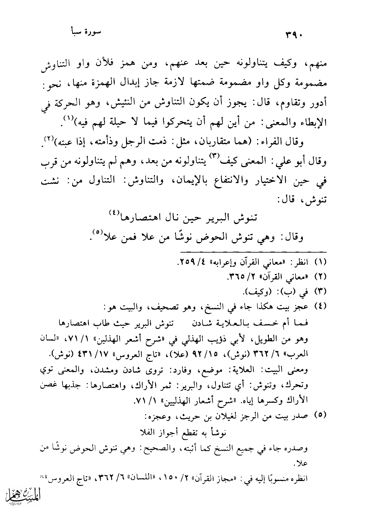 منهم، وكيف يتناولونه حين بعد عنهم، ومن همز فلأن واو التناوش مضمومة وكل واو مضمومة ضمتها لازمة جاز إبدال الهمزة منها، نحو: أدور وتقاوم، قال: يجوز أن يكون التناوش من النئيش، وهو الحركة في الإبطاء والمعنى: من أين لهم أن يتحركوا فيما لا حيلة لهم فيه) (¬1).