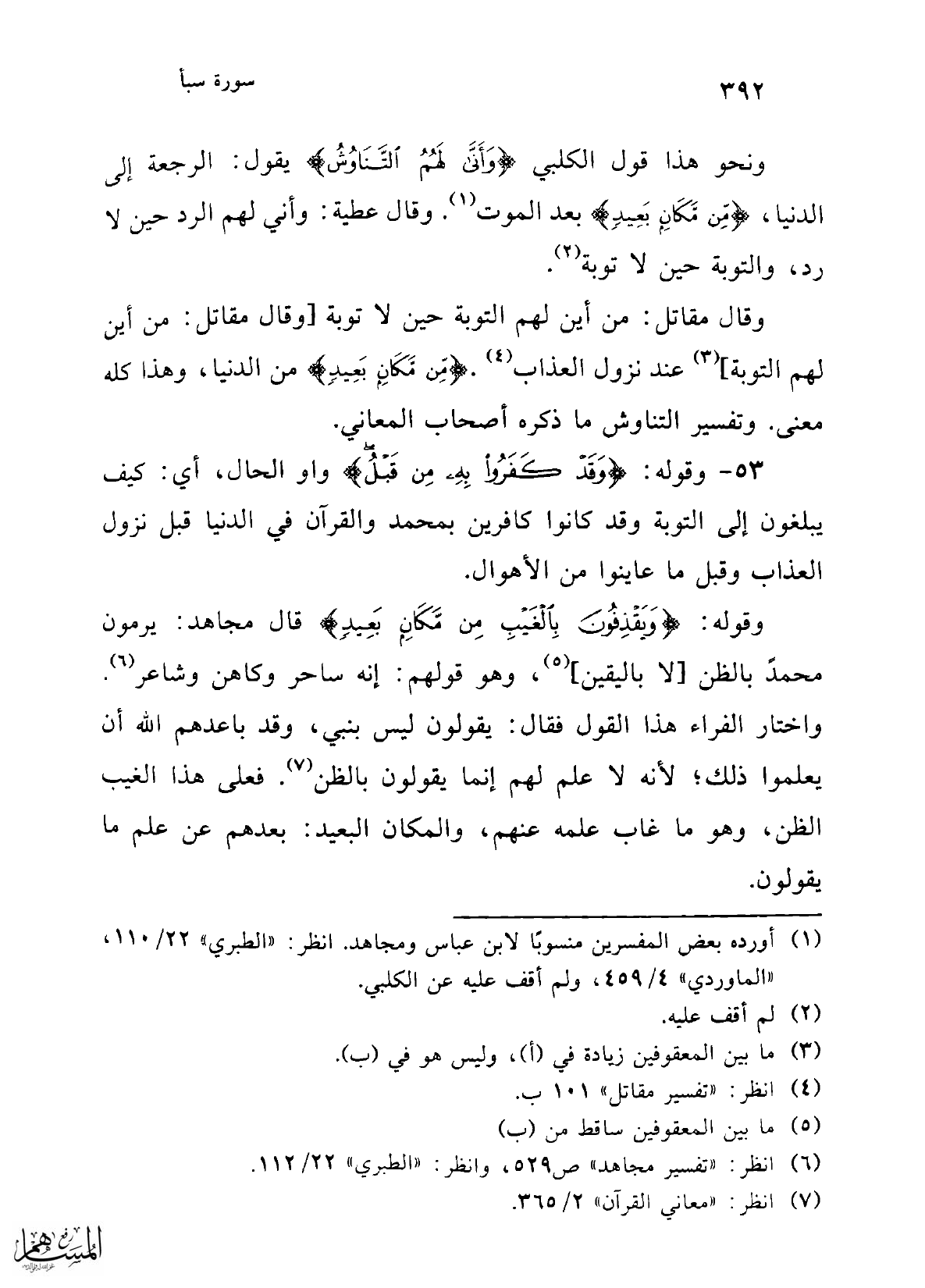ونحو هذا قول الكلبي {وَأَنَّى لَهُمُ التَّنَاوُشُ} يقول: الرجعة إلى الدنيا، {مِنْ مَكَانٍ بَعِيدٍ} بعد الموت (¬1). وقال عطية: وأني لهم الرد حين لا رد، والتوبة حين لا توبة (¬2).