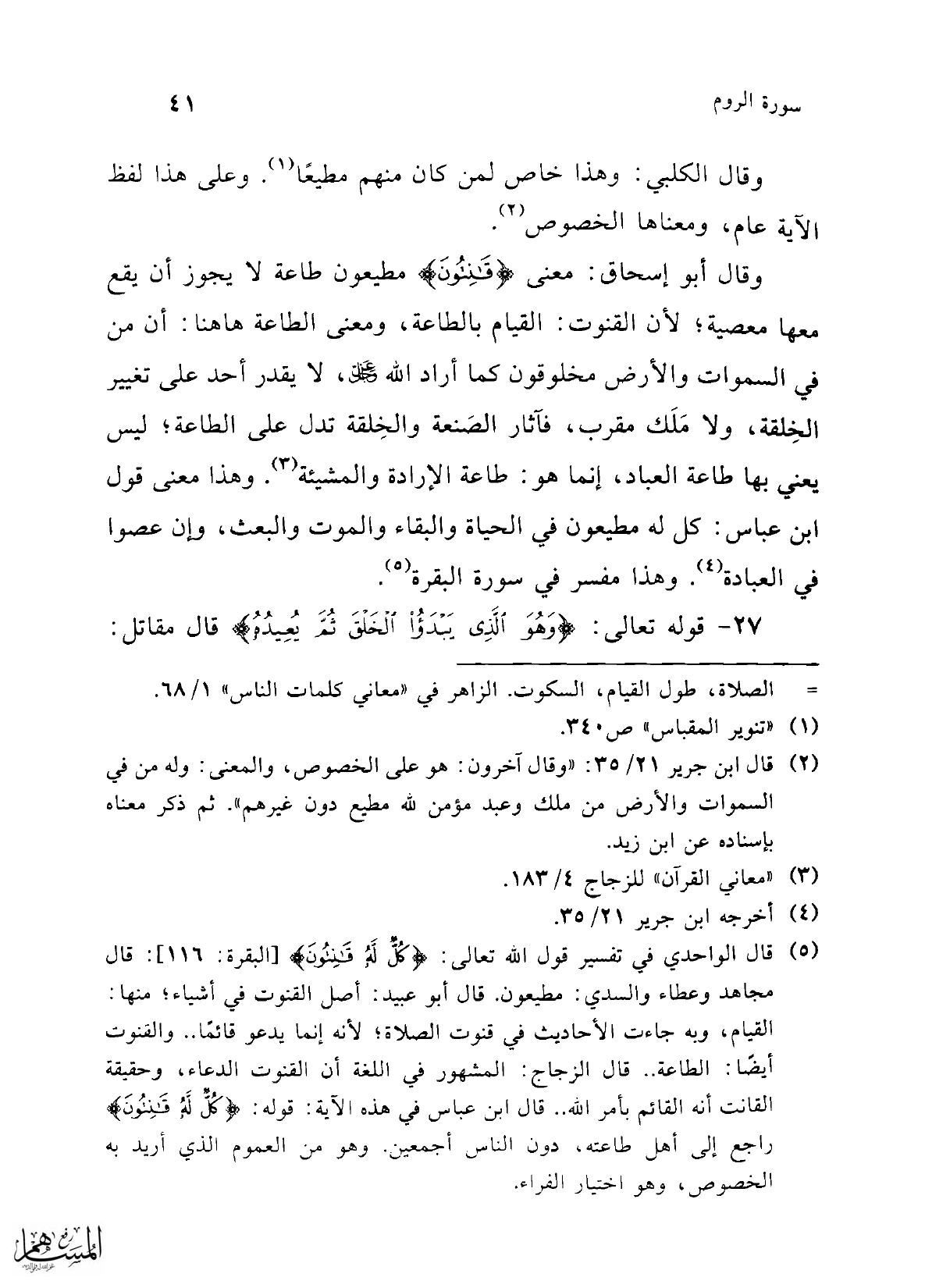 (¬5) قال الواحدي في تفسير قول الله تعالى: {كُلٌّ لَهُ قَانِتُونَ} [البقرة: 116]: قال مجاهد وعطاء والسدي: مطيعون. قال أبو عبيد: أجل القنوت في أشياء؛ منها: القيام، وبه جاءت الأحاديث في قنوت الصلاة؛ لأنه إنما يدعو قائمًا .. والقنوت أيضًا: الطاعة .. قال الزجاج: المشهور في اللغة أن القنوت الدعاء، وحقيقة القانت أنه القائم بأمر الله .. قال ابن عباس في هذه الآية: قوله: {كُلٌّ لَهُ قَانِتُونَ} راجع إلى أهل طاعته، دون الناس أجمعين. وهو من العموم الذي أريد به الخصوص، وهو اختيار الفراء.