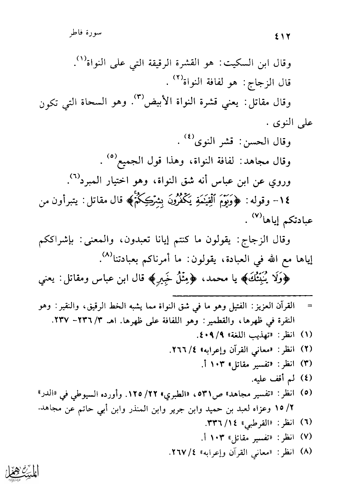 وقال مقاتل: يعني قشرة النواة الأبيض (¬3). وهو السحاة التي تكون على النوى.
