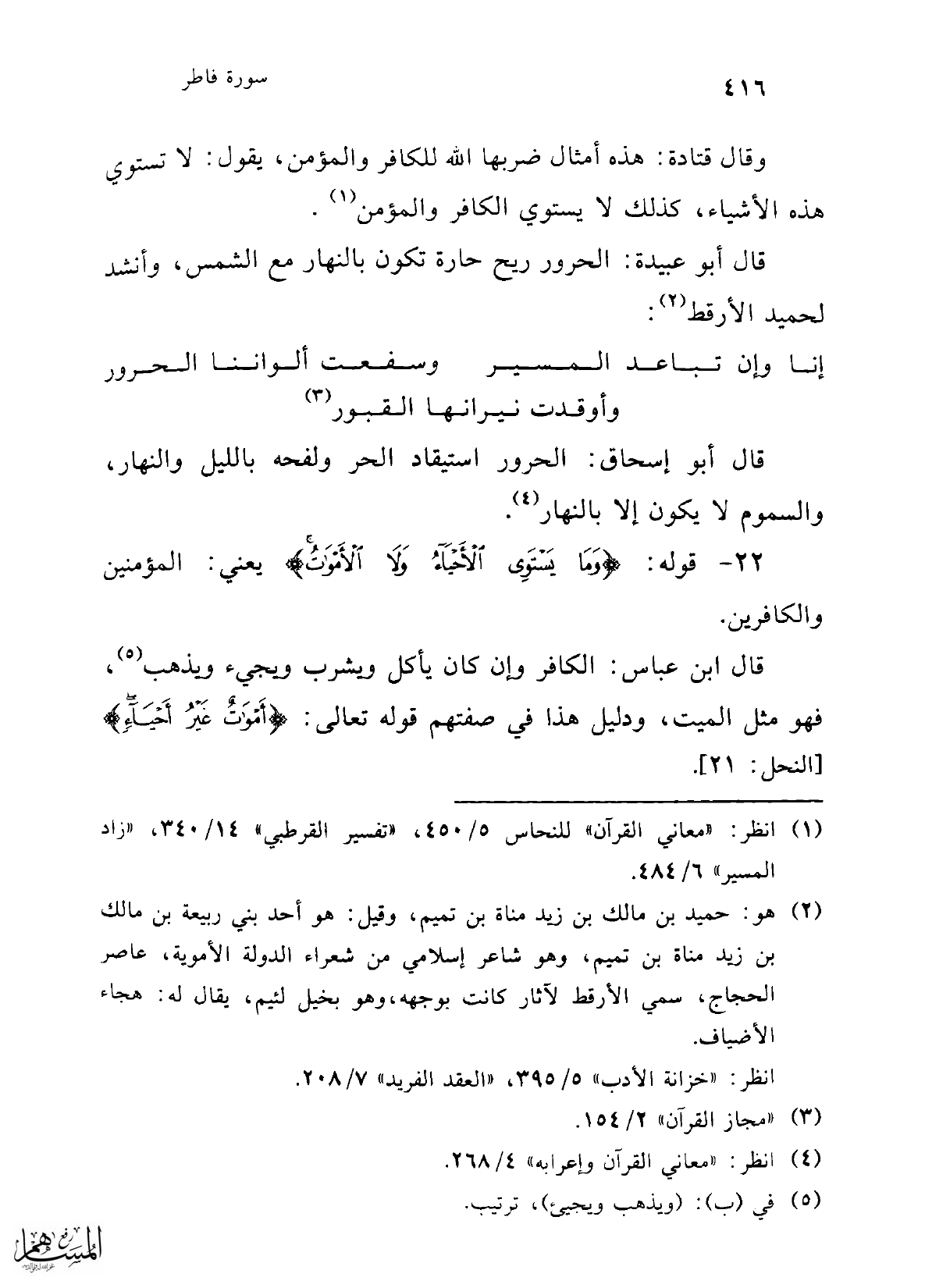 (¬1) انظر: "معاني القرآن" للنحاس 5/ 450، "تفسير القرطبي" 14/ 340، "زاد المسير" 6/ 484.