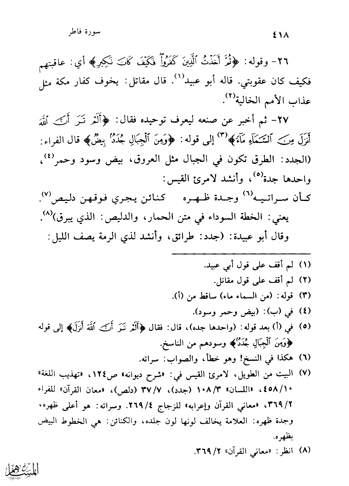 (¬5) في (أ) بعد قوله: (واحدها جده)، قال: فقال {أَلَمْ تَرَ أَنَّ اللَّهَ أَنْزَلَ} إلى قوله {وَمِنْ الْجِبَالِ جُدَدٌ} وسودهم من الناسخ.