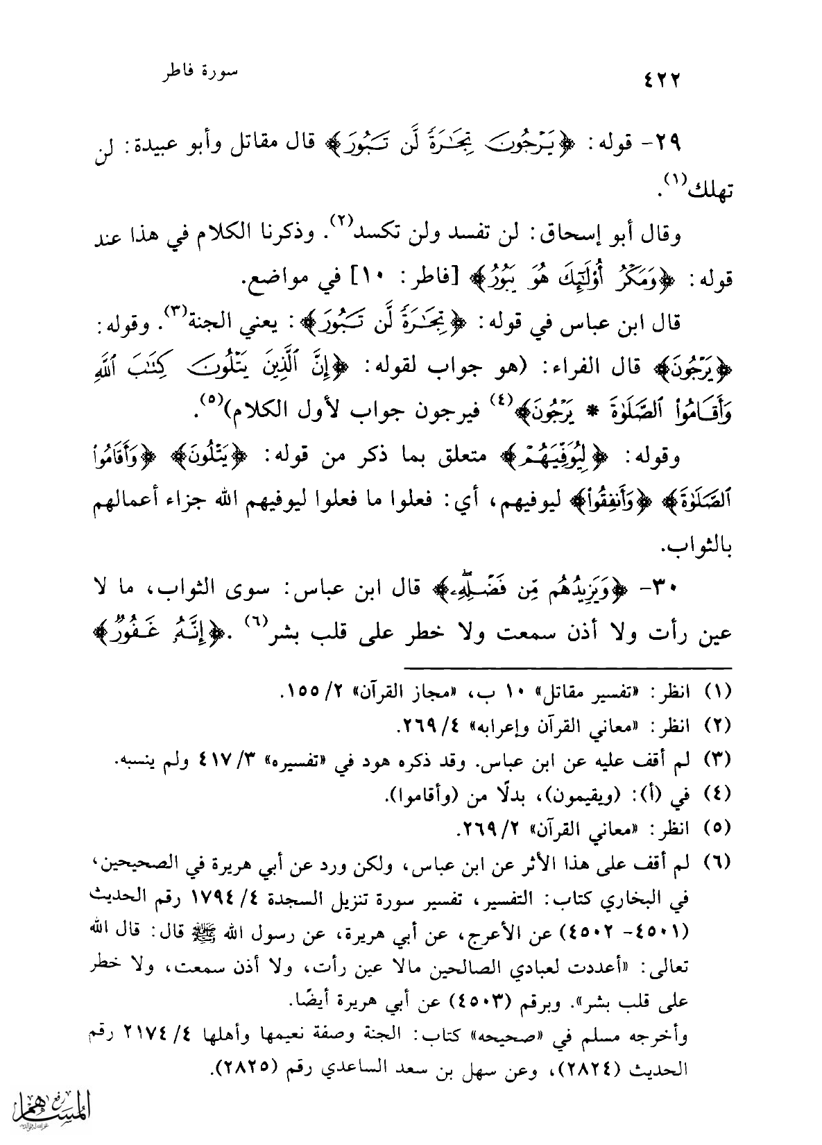 قال ابن عباس في قوله: {يَرْجُونَ تِجَارَةً لَنْ تَبُورَ}: يعني الجنة (¬3). وقول. {يَرْجُونَ} قال الفراء: (هو جواب لقوله: {إِنَّ الَّذِينَ يَتْلُونَ كِتَابَ اللَّهِ وَأَقَامُوا الصَّلَاةَ * يَرْجُونَ} (¬4) فيرجون جواب لأول الكلام) (¬5).