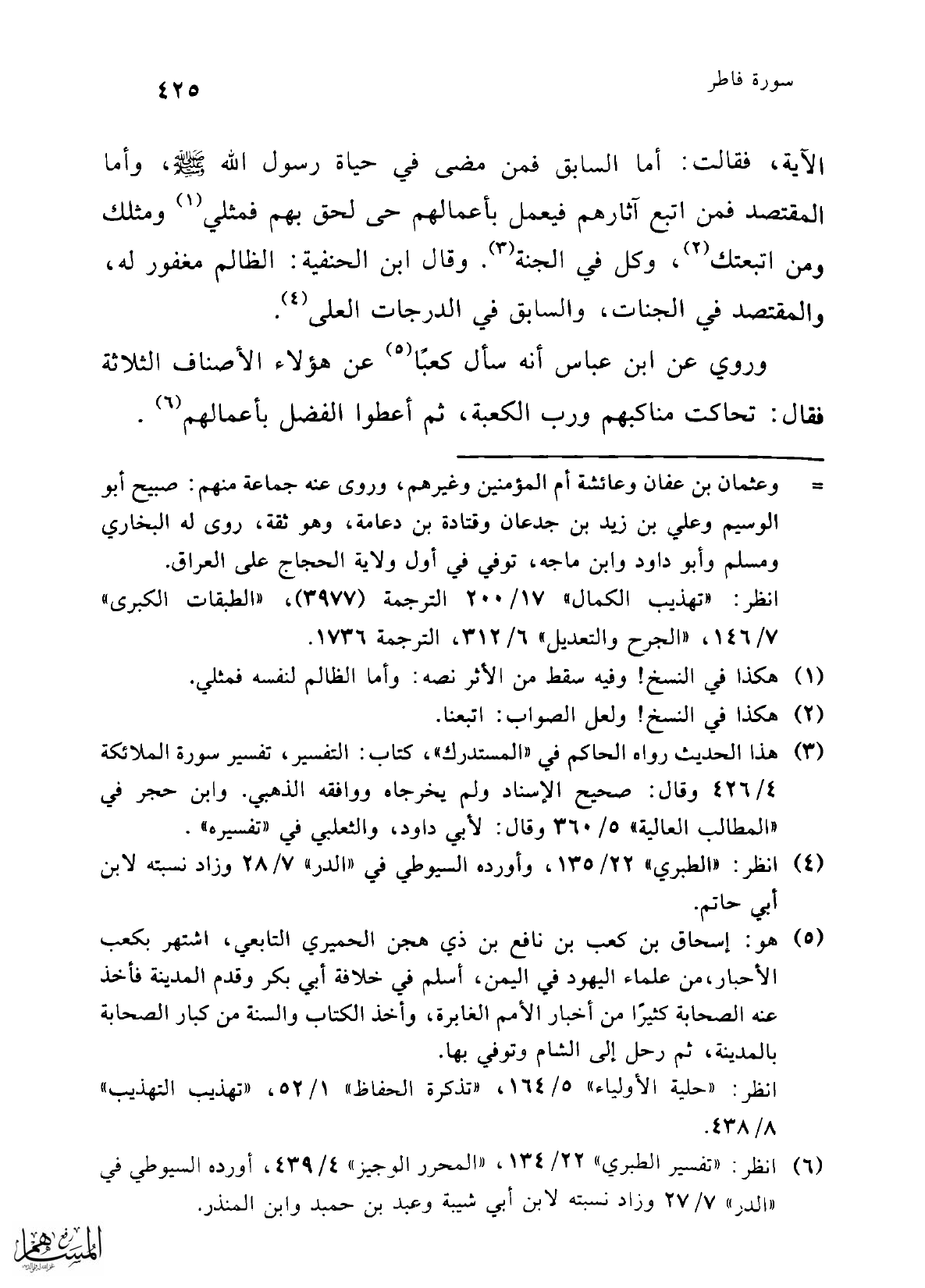 (¬3) هذا الحديث رواه الحاكم في"المستدرك"، كتاب: التفسير، تفسير سورة الملائكة 4/ 426 وقال: صحيح الإسناد ولم يخرجاه ووافقه الذهبي. وابن حجر في "المطالب العالية" 5/ 360 وقال: لأبي داود، والثعلبي في "تفسيره".