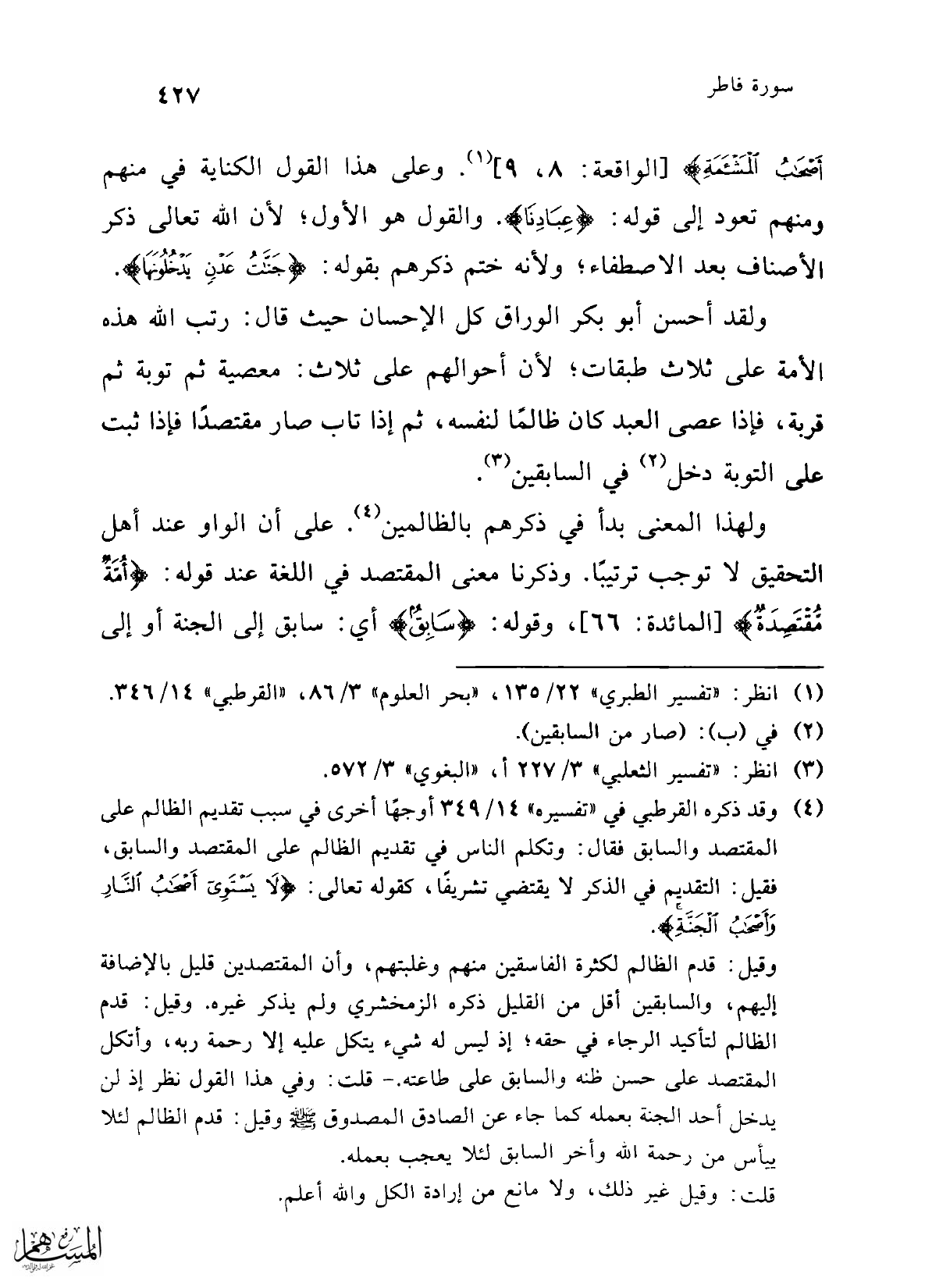 ولهذا المعنى بدأ في ذكرهم بالظالمين (¬4). على أن الواو عند أهل التحقيق لا توجب ترتيبًا. وذكرنا معنى المقتصد في اللغة عند قوله: {أُمَّةٌ مُقْتَصِدَةٌ} [المائدة: 66] وقوله: {سَابِقٌ} أي: سابق إلى الجنة أو إلى