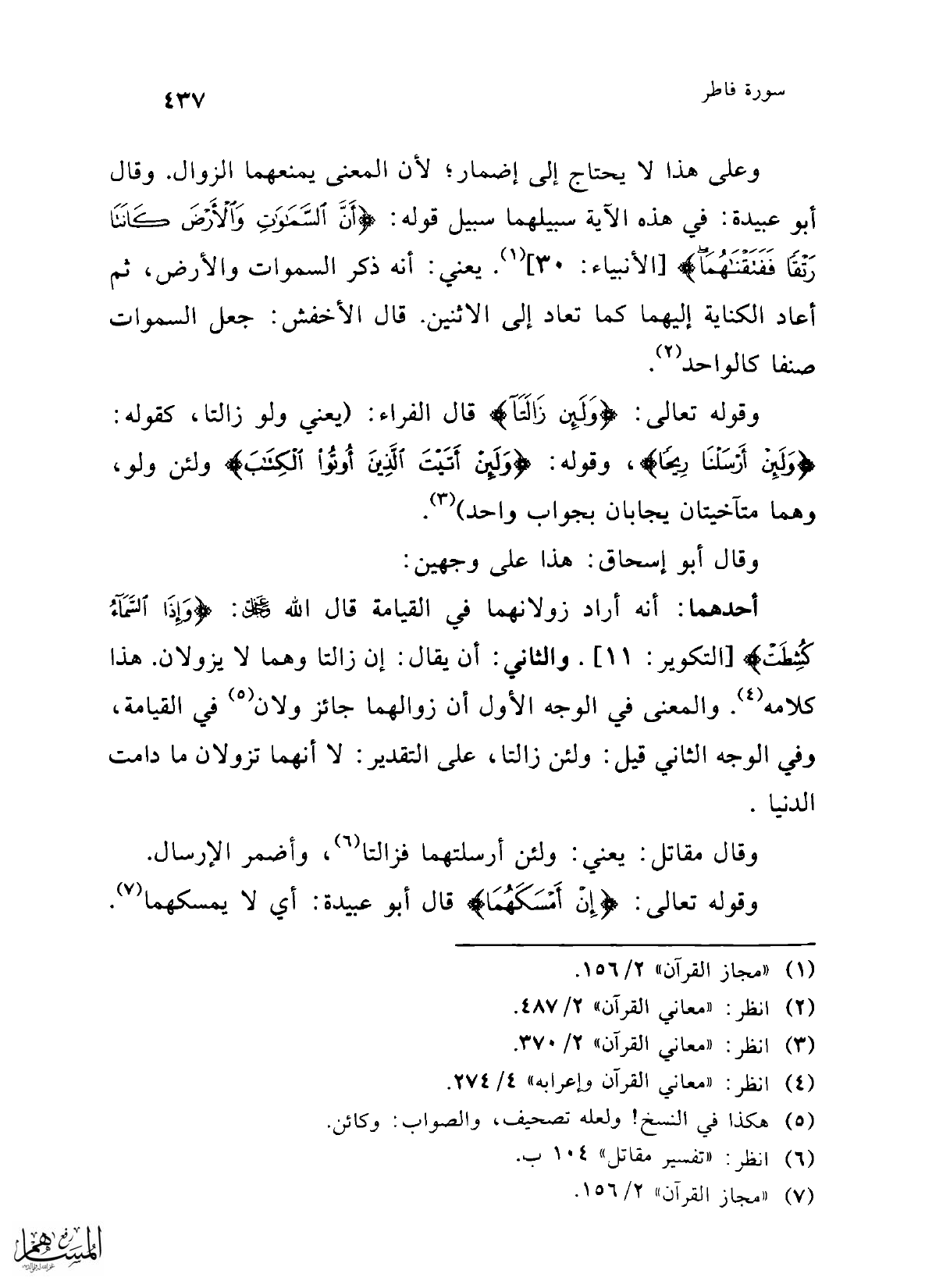 وعلى هذا لا يحتاج إلى إضمار؛ لأن المعنى يمنعهما الزوال. وقال أبو عبيدة: في هذه الآية سبيلهما سبيل قوله: {أَنَّ السَّمَاوَاتِ وَالْأَرْضَ كَانَتَا رَتْقًا فَفَتَقْنَاهُمَا} [الأنبياء: 30] (¬1). يعني: أنه ذكر السموات والأرض، ثم أعاد الكناية إليهما كما تعاد إلى الاثنين. قال الأخفش: جعل السموات صنفا كالواحد (¬2).