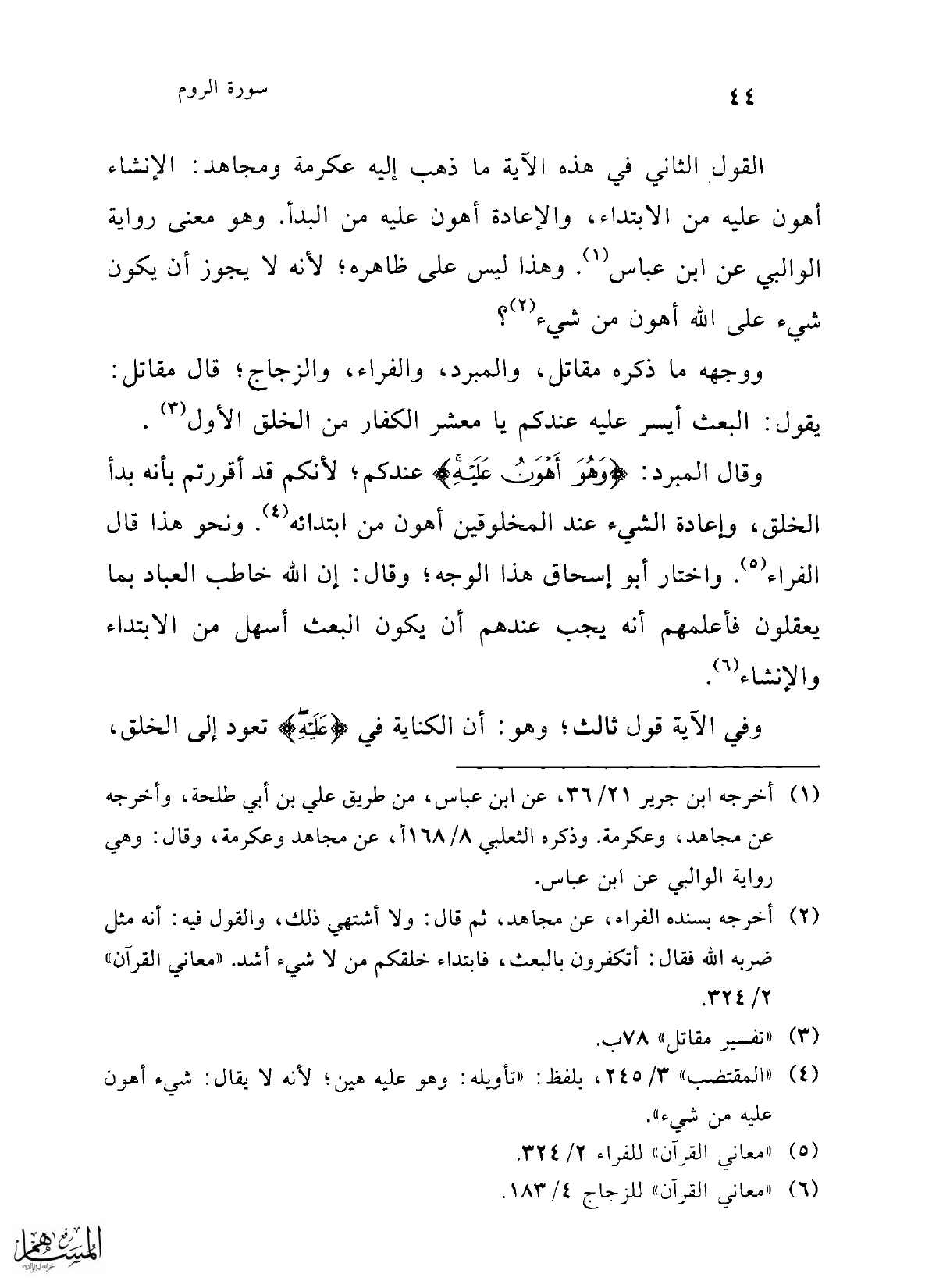 (¬4) "المقتضب" 3/ 245، بلفظ: "تأويله: وهو عليه هين؛ لأنه لا يقال: شيء أهون عليه من شيء".