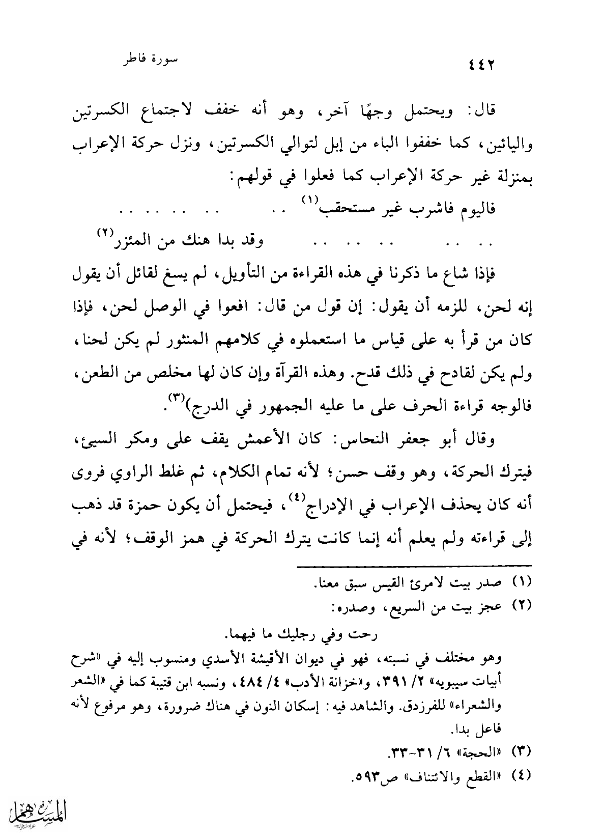 وقال أبو جعفر النحاس: كان الأعمش يقف على ومكر السيئ، فيترك الحركة، وهو وقف حسن؛ لأنه تمام الكلام، ثم غلط الراوي فروى أنه كان يحذف الإعراب في الإدراج (¬4)، فيحتمل أن يكون حمزة قد ذهب إلى قراءته ولم يعلم أنه إنما كانت يترك الحركة في همز الوقف؛ لأنه في