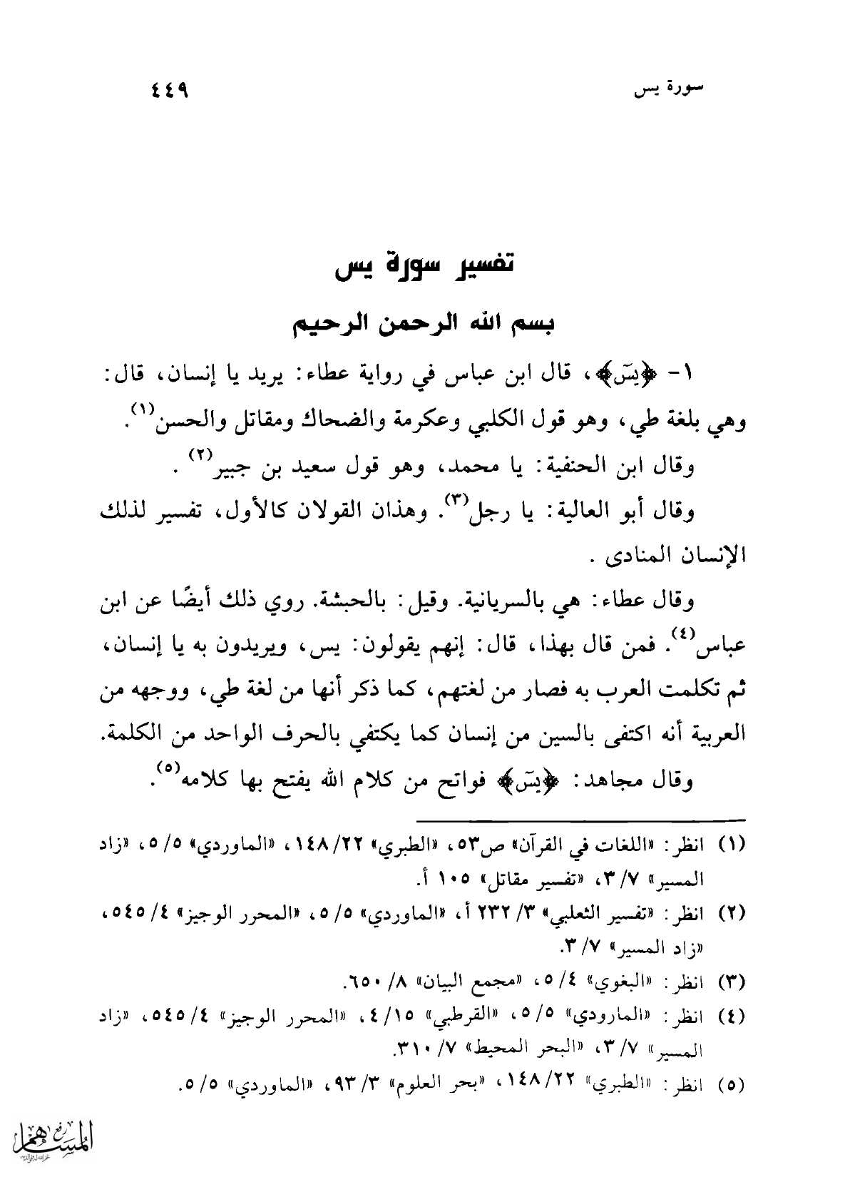 1 - {يس}، قال ابن عباس في رواية عطاء: يريد يا إنسان، قال: وهي بلغة طي، وهو قول الكلبي وعكرمة والضحاك ومقاتل والحسن (¬1).