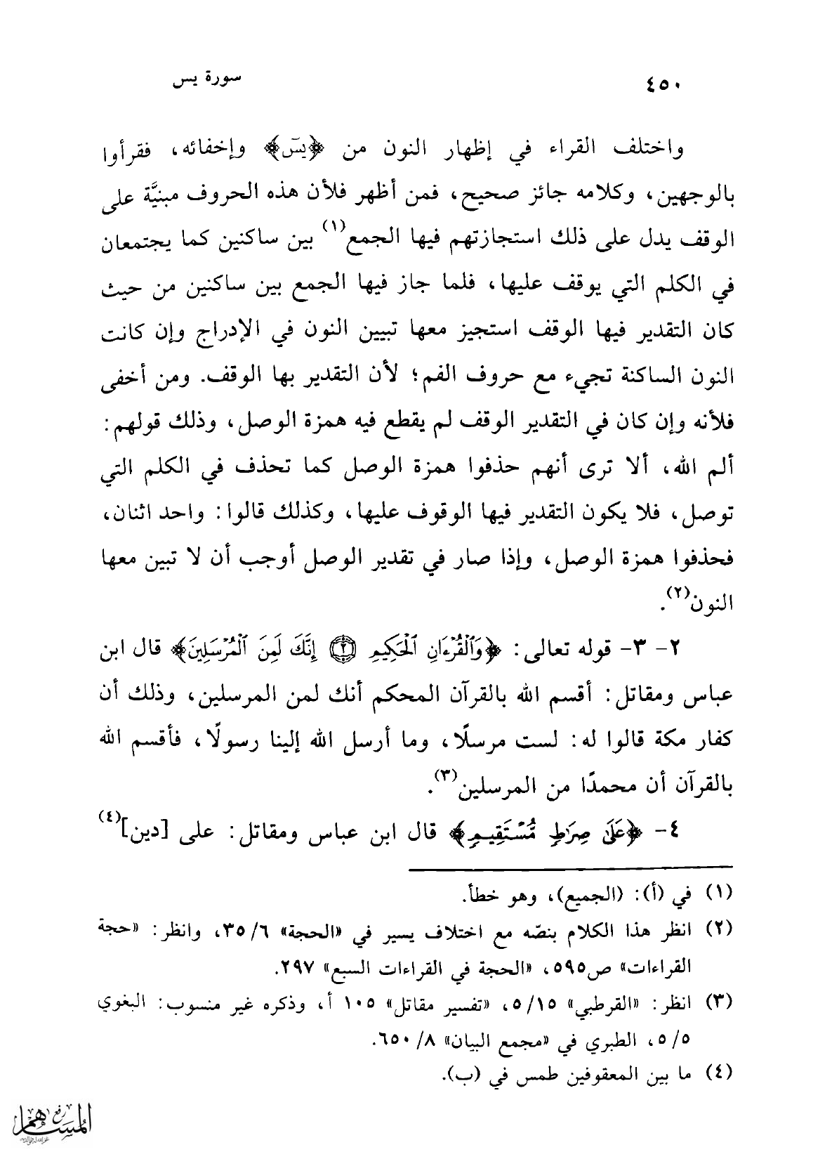 واختلف القراء في إظهار النون من {يس} وإخفائه، فقرأوا بالوجهين، وكلامه جائز صحيح، فمن أظهر فلأن هذه الحروف مبنيَّة علي الوقف يدل على ذلك استجازتهم فيها الجمع (1) بين ساكنين كما يجتمعان في الكلم التي يوقف عليها، فلما جاز فيها الجمع بين ساكنين من حيث كان التقدير فيها الوقف استجيز معها تبيين النون في الإدراج وإن كانت النون الساكنة تجيء مع حروف الفم؛ لأن التقدير بها الوقف. ومن أخفى فلأنه وإن كان في التقدير الوقف لم يقطع فيه همزة الوصل، وذلك قولهم: ألم الله، ألا ترى أنهم حذفوا همزة الوصل كما تحذف في الكلم التي توصل، فلا يكون التقدير فيها الوقوف عليها، وكذلك قالوا: واحد اثنان، فحذفوا همزة الوصل، وإذا صار في تقدير الوصل أوجب أن لا تبين معها النون (2).