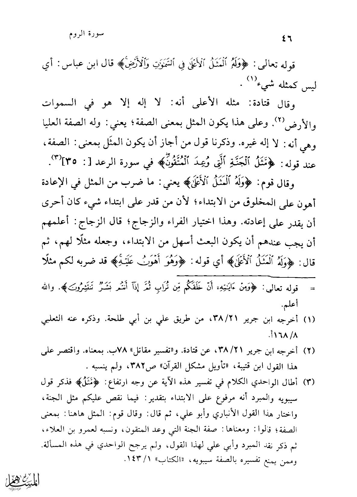 قوله تعالى: {وَلَهُ الْمَثَلُ الْأَعْلَى فِي السَّمَاوَاتِ وَالْأَرْضِ} قال ابن عباس: أي ليس كمثله شيء (¬1).
