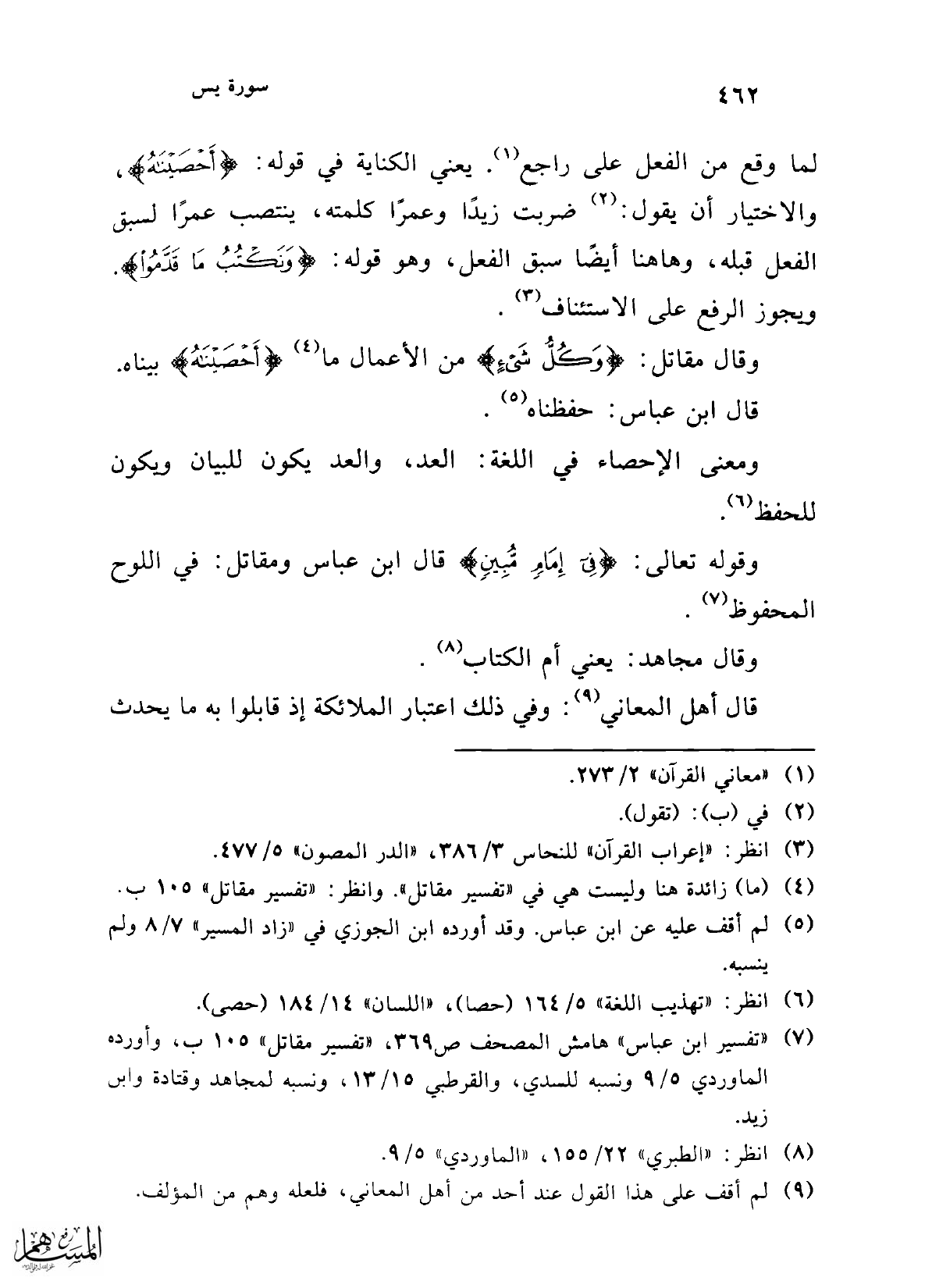 لما وقع من الفعل على راجع (¬1). يعني الكناية في قوله: {أَحْصَيْنَاهُ} والاختيار أن يقول: (¬2) ضربت زيدًا وعمرًا كلمته، ينتصب عمرًا لسبق الفعل قبله، وهاهنا أيضًا سبق الفعل، وهو قوله: {وَنَكْتُبُ مَا قَدَّمُوا}. ويجوز الرفع على الاستئناف (¬3).