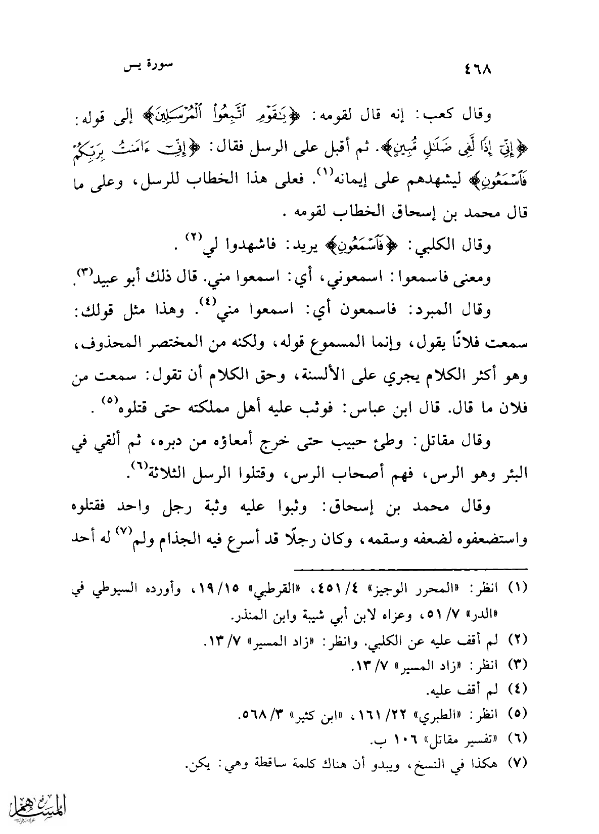 وقال كعب: إنه قال لقومه: {يَا قَوْمِ اتَّبِعُوا الْمُرْسَلِينَ} إلى قوله: {إِنِّي إِذًا لَفِي ضَلَالٍ مُبِينٍ}. ثم أقبل على الرسل فقال: {إِنِّي آمَنْتُ بِرَبِّكُمْ فَاسْمَعُونِ} ليشهدهم على إيمانه (¬1). فعلى هذا الخطاب للرسل، وعلى ما قال محمد بن إسحاق الخطاب لقومه.