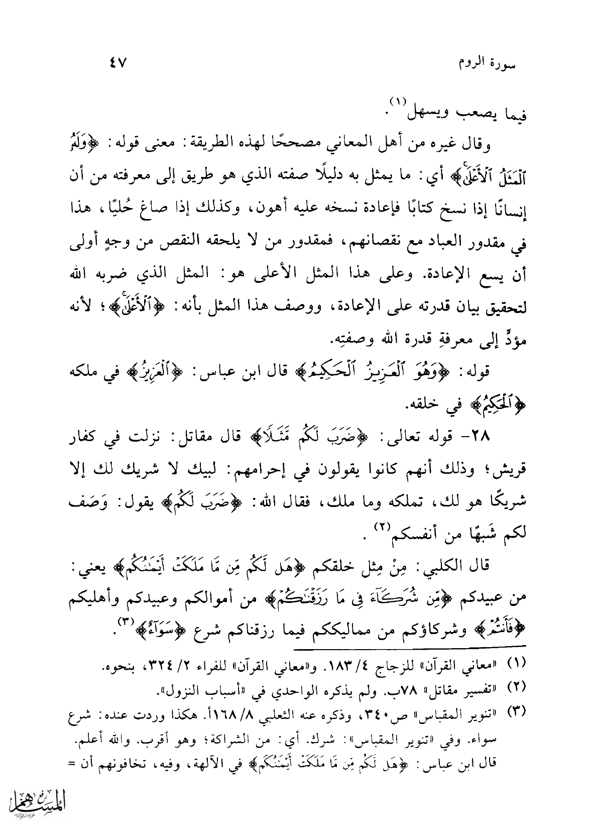 وقال غيره من أهل المعاني مصححًا لهذه الطريقة: معنى قوله: {وَلَهُ الْمَثَلُ الْأَعْلَى} أي: ما يمثل به في دليلاً صفته الذي هو طريق إلى معرفته من أن إنسانًا إذا نسخ كتابًا فإعادة نسخه عليه أهون، وكذلك إذا صاغ حُليًا، هذا في مقدور العباد مع نقصانهم، فمقدور من لا يلحقه النقص من وجهٍ أولى أن يسع الإعادة. وعلى هذا المثل الأعلى هو: المثل الذي ضربه الله لتحقيق بيان قدرته على الإعادة، ووصف هذا المثل بأنه: {الْأَعْلَى}؛ لأنه مؤدٍّ إلى معرفةِ قدرة الله وصفتِه.